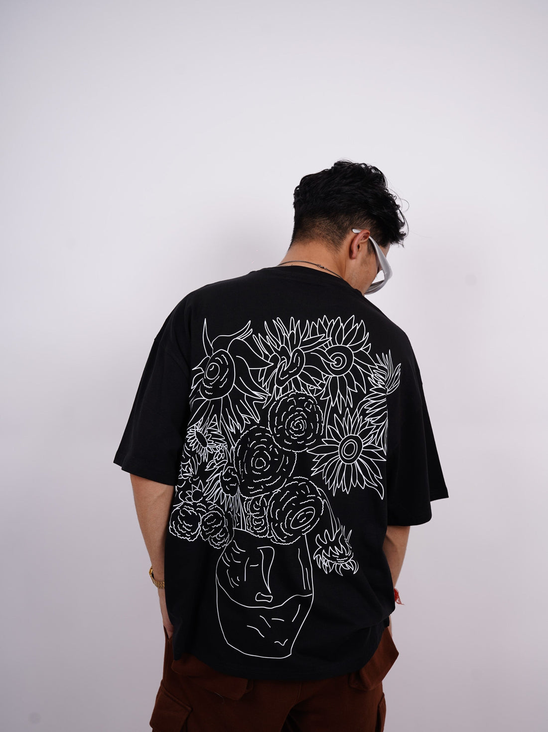 Elevate your streetwear with this black oversized T-shirt featuring an intricate white floral line-art print...
