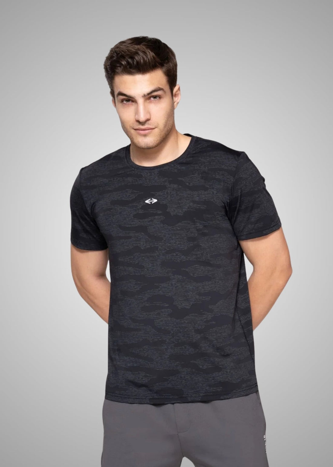 Elevate your activewear game with this allover camouflage print t-shirt, designed for a rugged and...