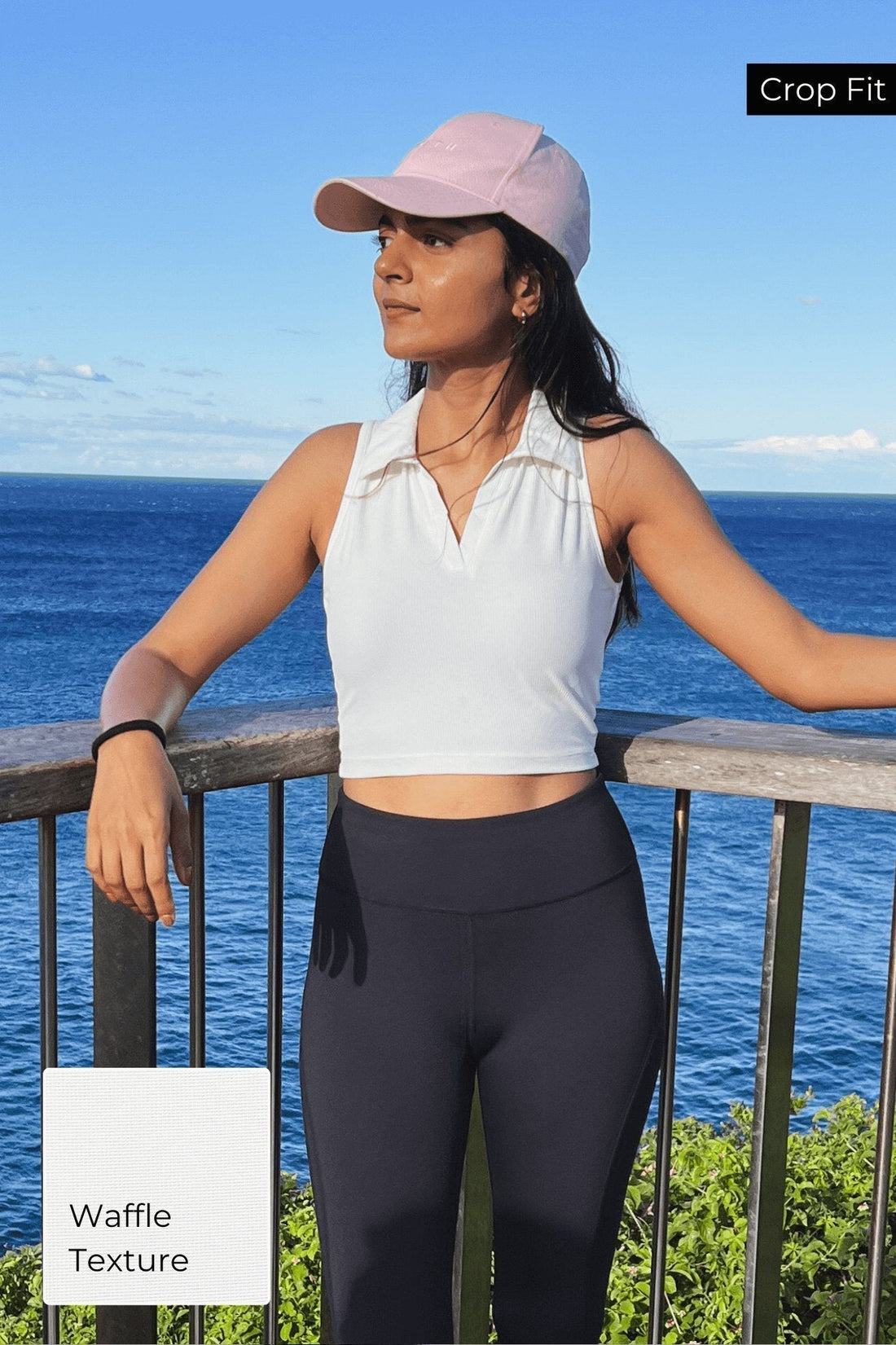 Why You NEED This: The Waffle Quick-Dry Sleeveless Collared Crop Top in Snow White is...