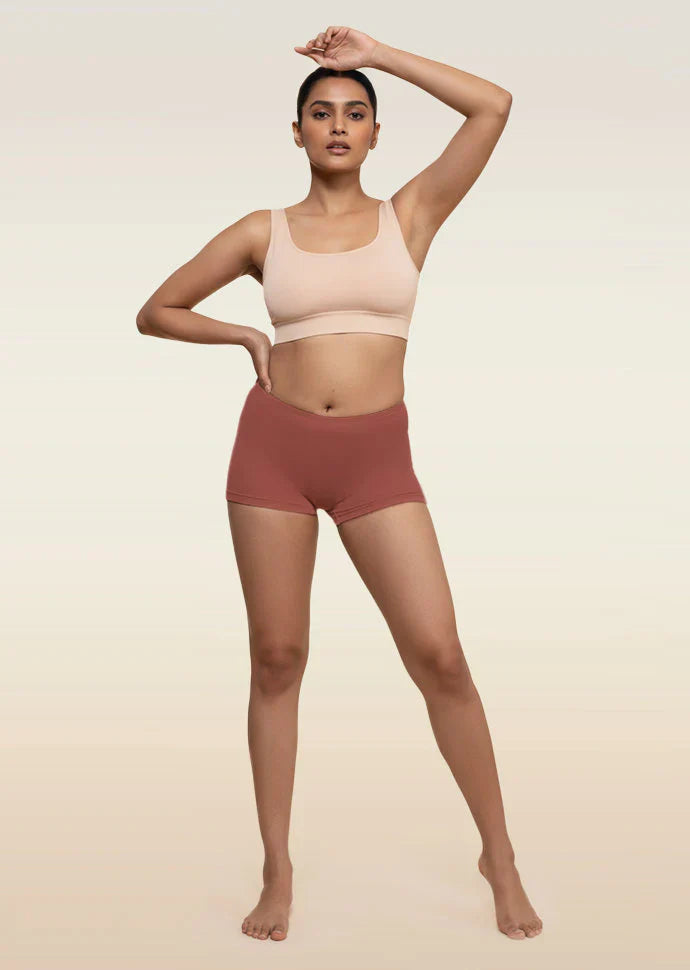 The Assorted Pack of 3 –Soft, smart, and made to move with you — Moisture-Wicking Modal Boyshorts – Black, Beige and Red brings leak-proof ease in three everyday shades. Odour-resistant, full-coverage, and proudly made for real Indian bodies.