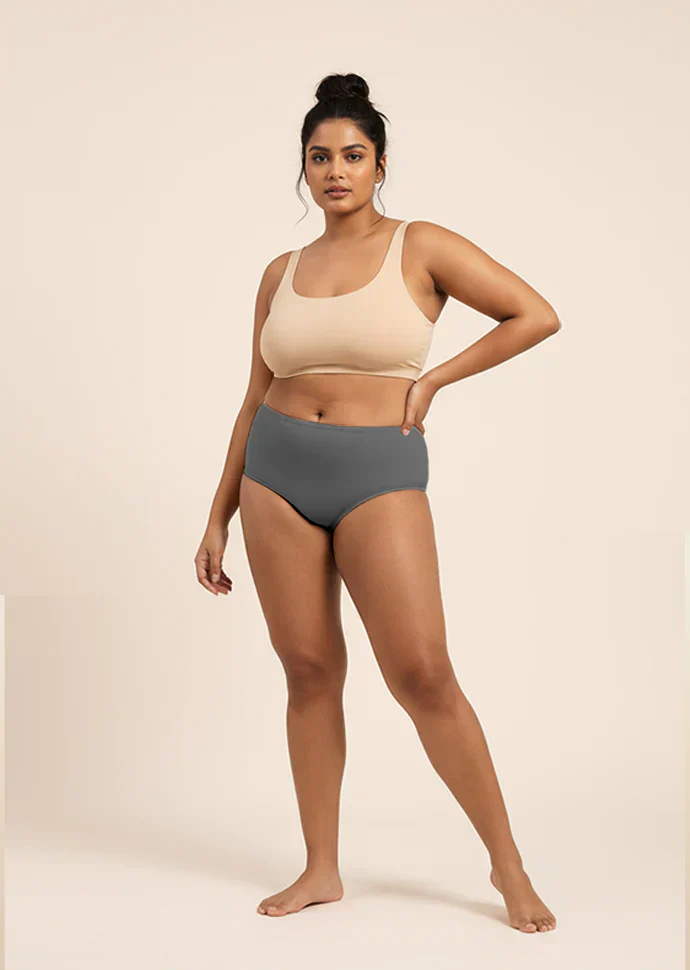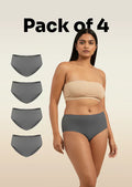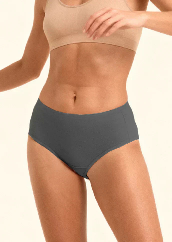 The Pack of 4 - Moisture-Wicking Modal Underwear – Grey Midwaist is crafted from buttery-soft modal fabric with Tilt’s patented, gynaec-recommended absorbent lining. It wicks light leaks, discharge, and sweat to keep you dry and comfy all day absorbing up to 5–8ml per wear.