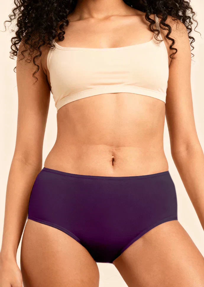 Pack of 6 – Moisture-Wicking Modal Fabric Underwear – Merlot Violet Midwaist, built for comfort that moves with you. With full-back coverage, a wider gusset, and breathable modal softness—this leak-proof essential is proudly made in India, by leaky folks for leaky folks.