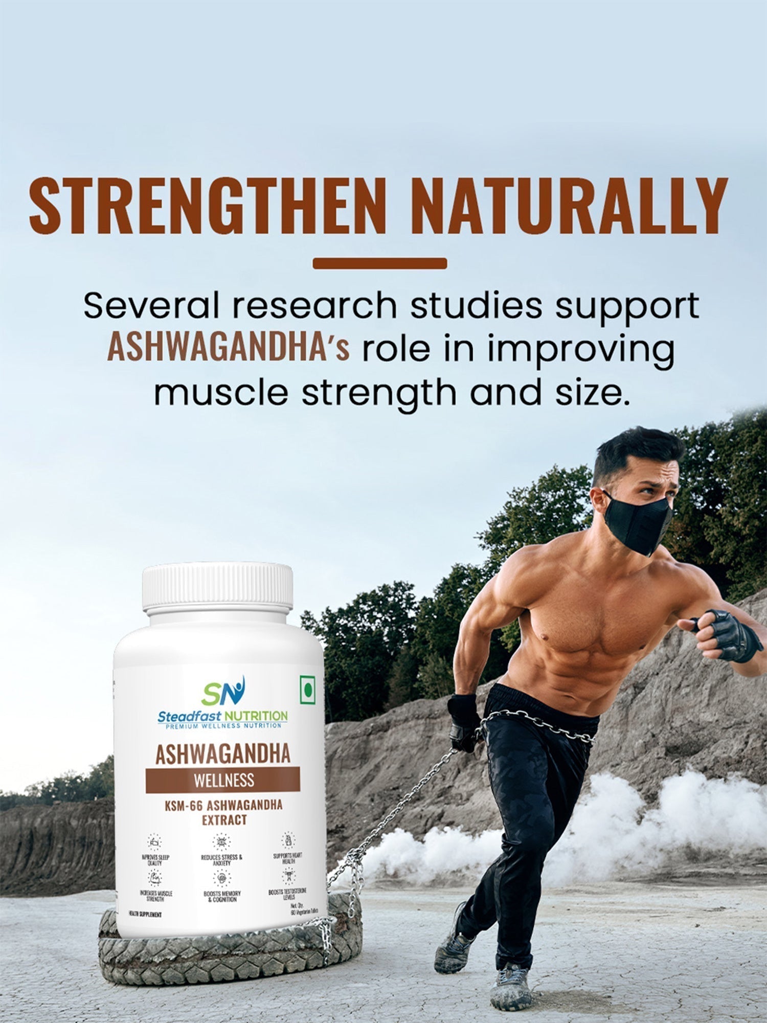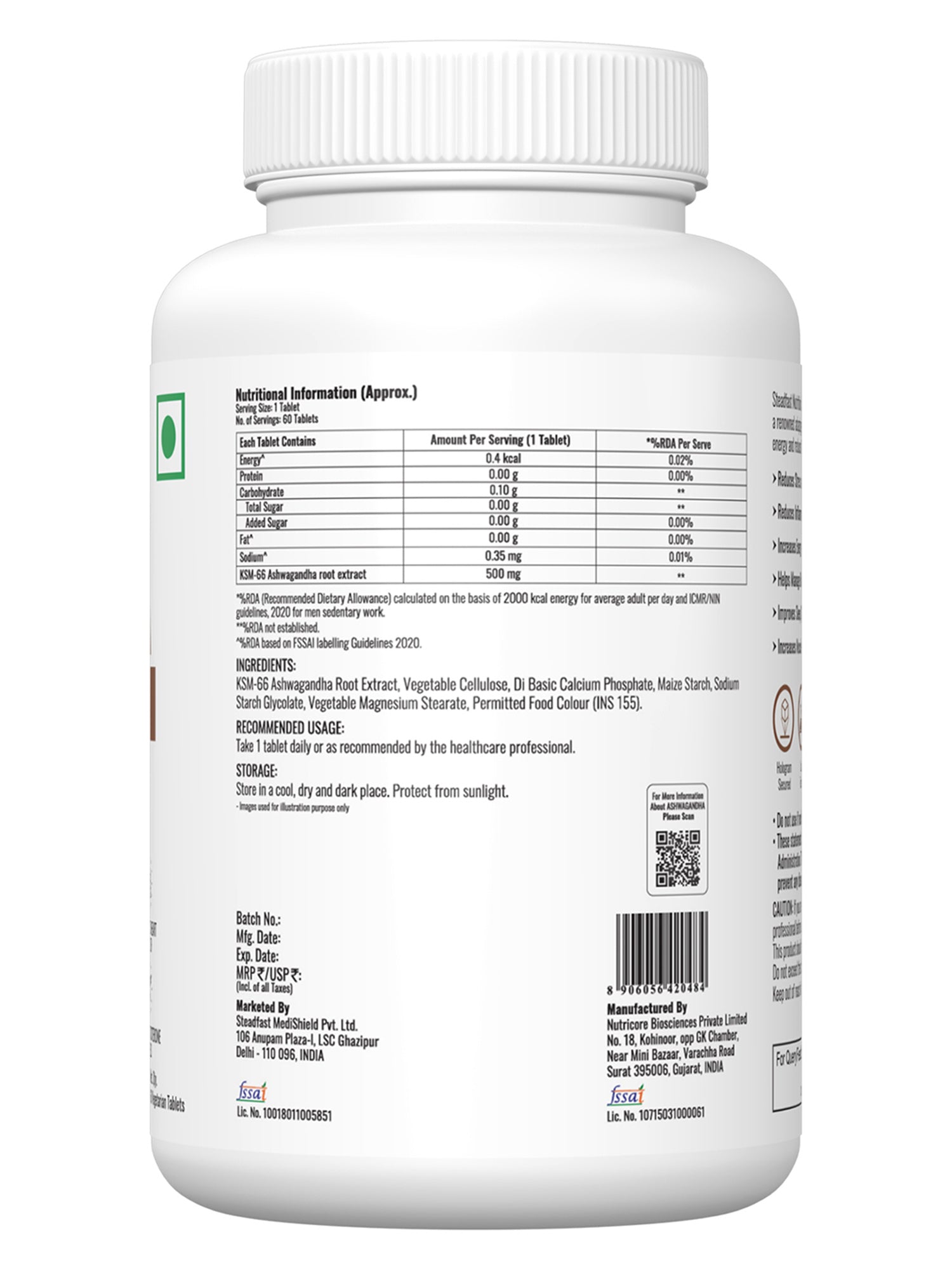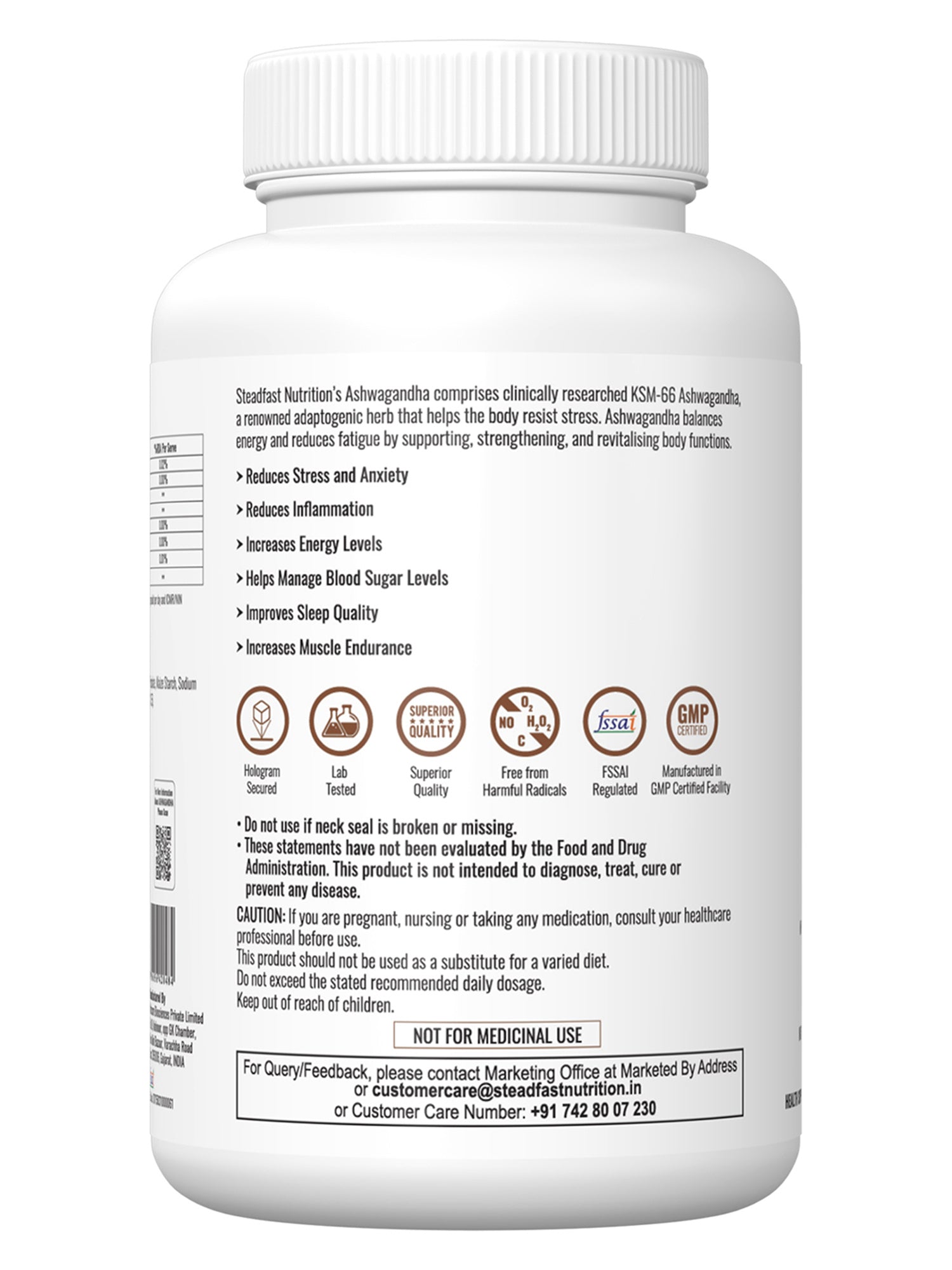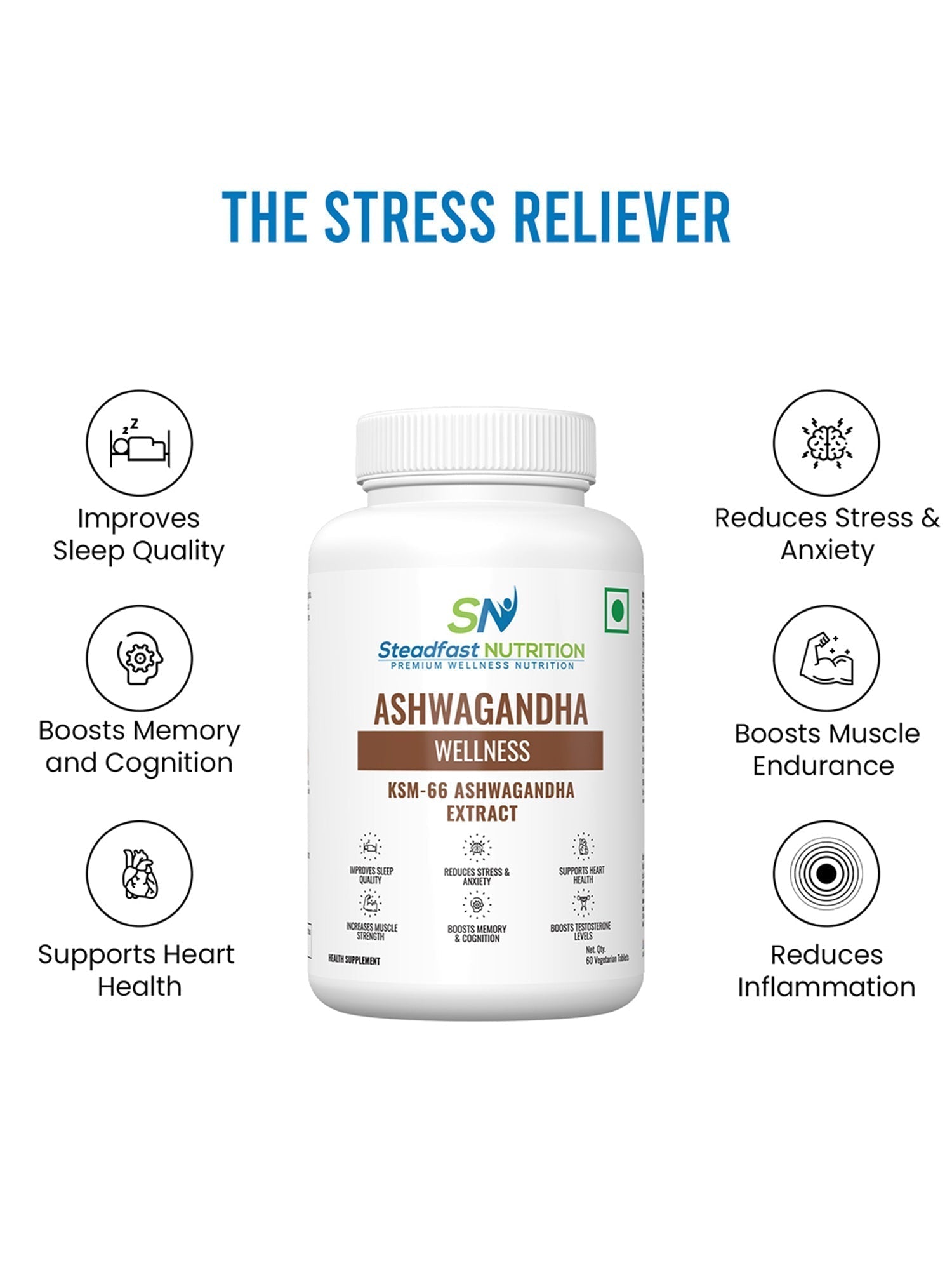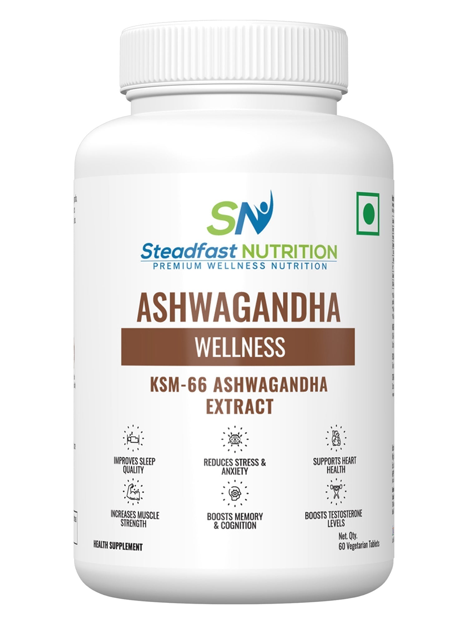 No Returns  Steadfast Nutrition’s Ashwagandha comprises 500 mg of clinically researched KSM-66 Ashwagandha roots extract, a renowned adaptogenic herb that helps the body resist stress, balances energy and reduces fatigue by supporting, strengthening, and revitalising body functions. Ashwagandha, also known as Indian Ginseng and Indian winter cherry, is rich in antioxidants and has multiple health benefits, including anti-tumour, anti-inflammatory and hypoglycaemic properties. It is popular as a general tonic due to its rejuvenating effects. KSM-66 roots extract is produced by a unique extraction process based on green chemistry principles, making the final product a balanced blend various constituents as in original herb, without diluting any one constituent.