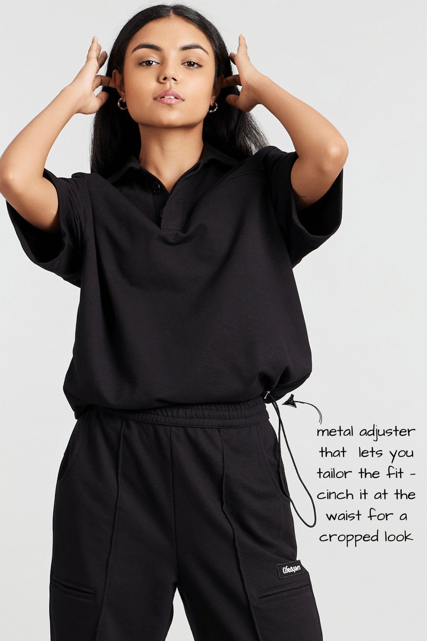 Why You NEED This: The True Black Hybrid Polo Tee is a versatile essential, blending classic style with modern functionality. With a relaxed fit and sleek polo collar, this tee stands out with a convertible metal waist adjuster that allows for a cinched, cropped look when you want to switch things up. Perfect for creating a polished yet casual vibe, this tee is a wardrobe must-have for any occasion.