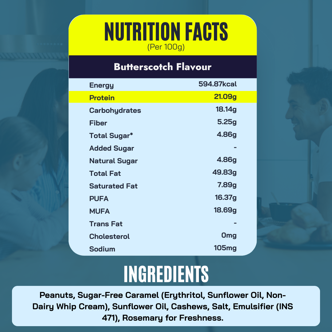 Rich in Protein and Healthy Fats. Features Sugar-Free Caramel and Peanuts that support energy levels and muscle recovery. Indulgent but guilt-free, it’s like a dessert in every spoonful!