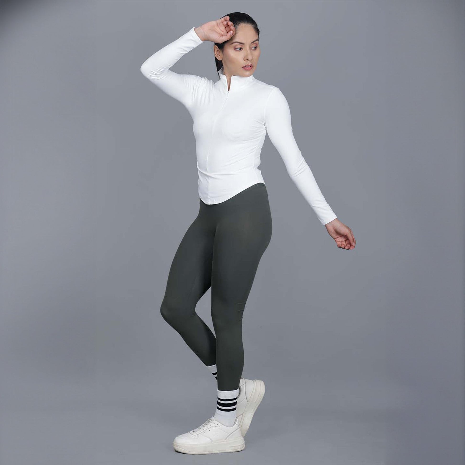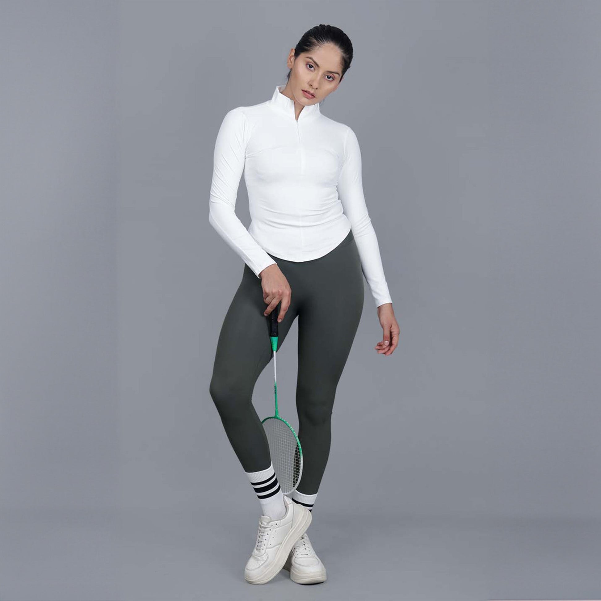 Discover Chiclo’s latest athleisure wear set, crafted for both style and performance. This set includes green seamless high-waisted tights with an ankle fit, designed to be squat-proof and ensure a smooth silhouette without camel toe formation. It also features a white dri-fit T-shirt with a classic polo neck and a chic short chain detail, combining function with a touch of elegance. Completing the look is a pair of white socks with stylish striped detailing. Made from premium quality fabric, this set resists color bleed and pilling, ensuring lasting vibrancy and freshness. Elevate your workout wardrobe with Chiclo’s perfect blend of comfort and style.