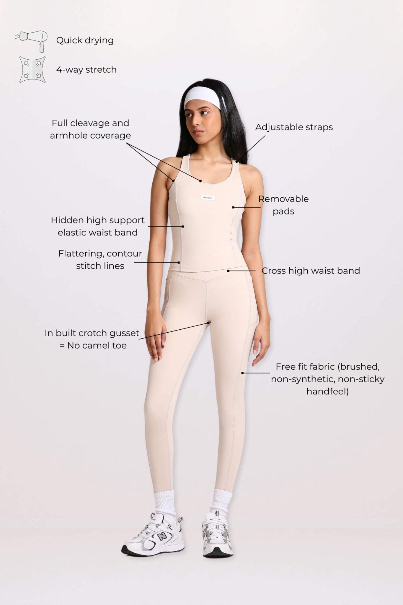 Why You NEED This: This set is the definition of snatched but comfy. The Longline Sports Bra delivers high support, a compressive fit, and an ultra-flattering silhouette that keeps you locked in without sacrificing comfort. The Cross-Leggings feature a sculpting crossover waistband that enhances your shape while staying breathable and flexible. With built-in pockets and our custom Free Fit fabric, this set is soft, quick-drying, and designed to handle Indian heat & humidity.