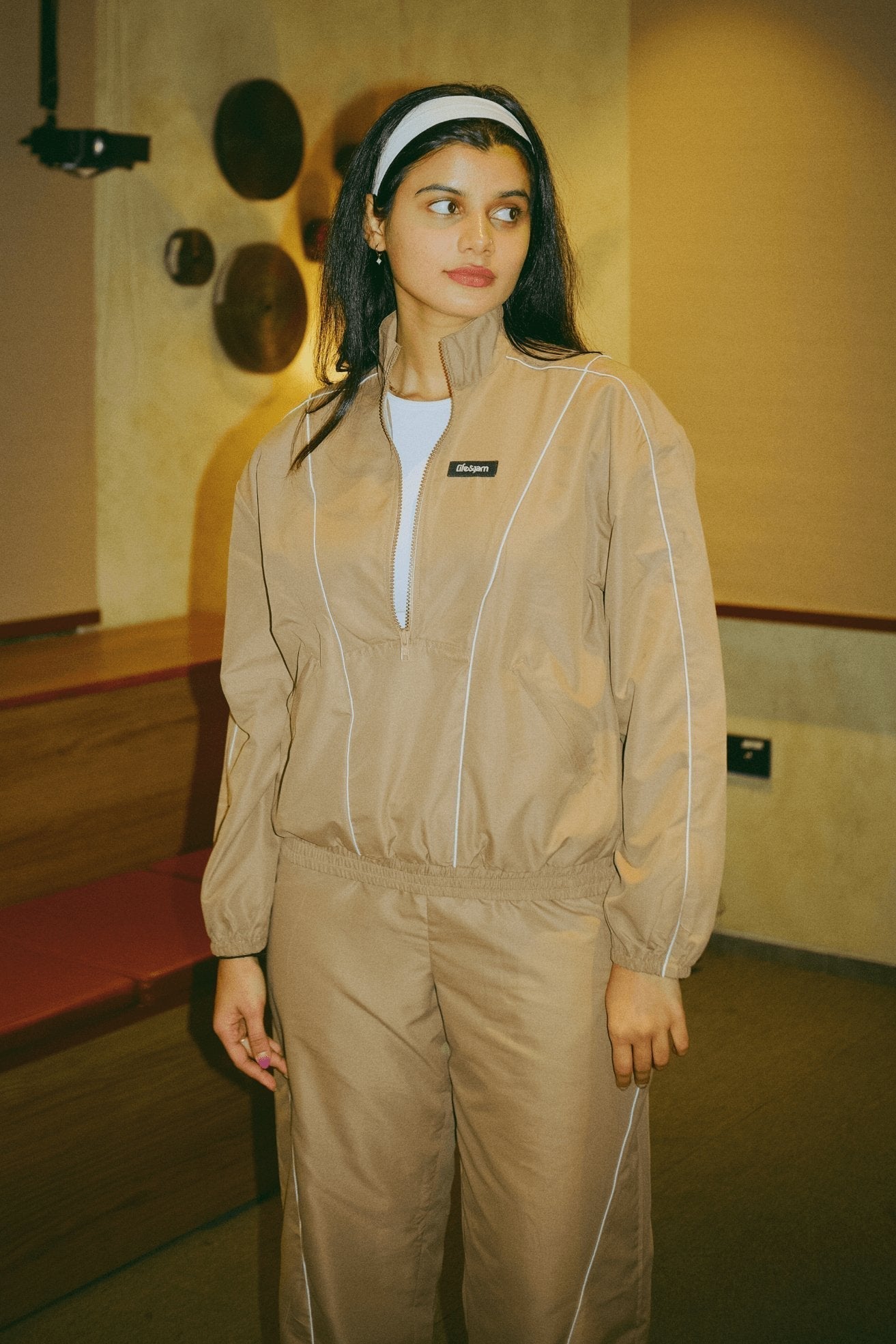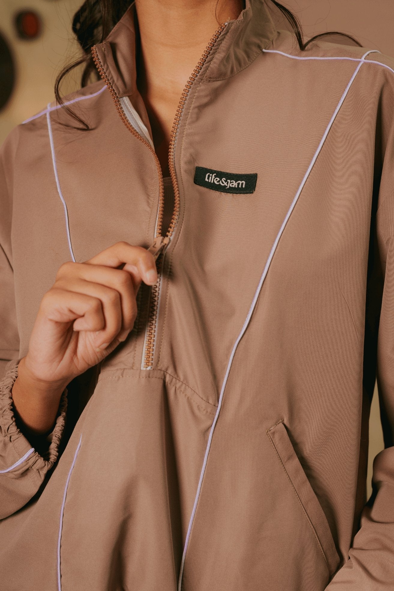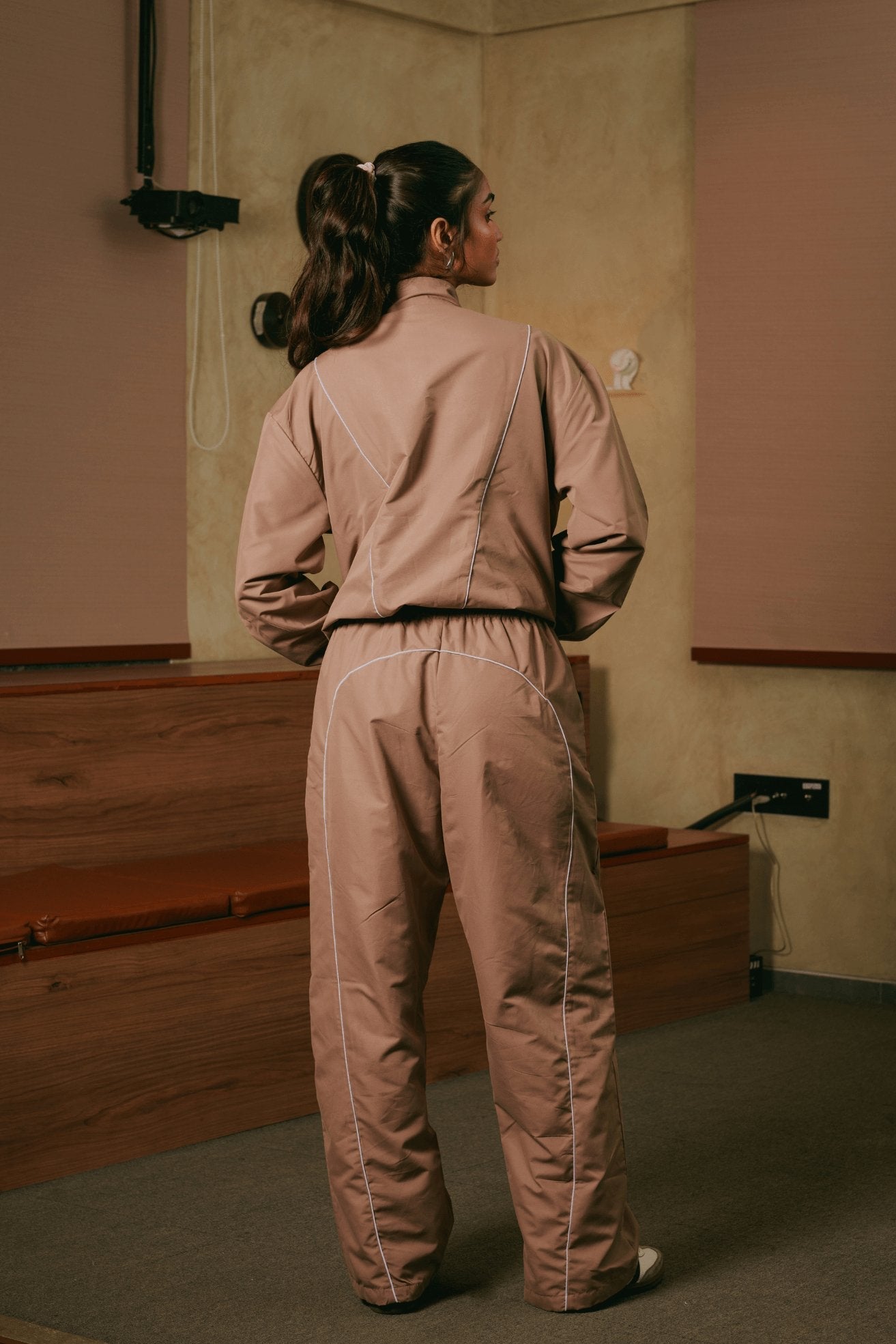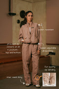 Why You NEED This: The Take A Hike Pants & Jacket Co-ord Set in Earthstone is built for all-weather adventures. This stylish set features water-resistant fabric with sleek white piping, making it both functional and fashionable. The pants have zips at the bottom as a style element, while the jacket offers functional zips for practicality. The brand patch adds a sporty touch, making this co-ord set perfect for outdoor activities or casual wear.