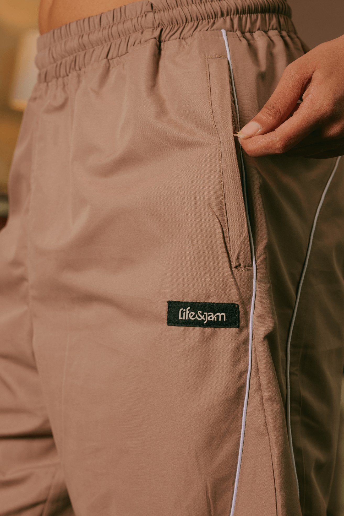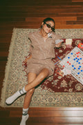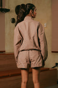 Why You NEED This: The Take A Hike Shorts & Pullover Co-ord Set in Earthstone is the perfect blend of style and utility. Made from water-resistant, all-weather fabric, this set is designed to keep you comfortable and dry, whether you're on the trail or running errands. The sleek white piping on both the shorts and jacket adds a stylish edge, while the brand patch completes the sporty look. With functional zips on the jacket and a drawstring elastic waistband on the shorts, this set is ready for whatever your day has in store.