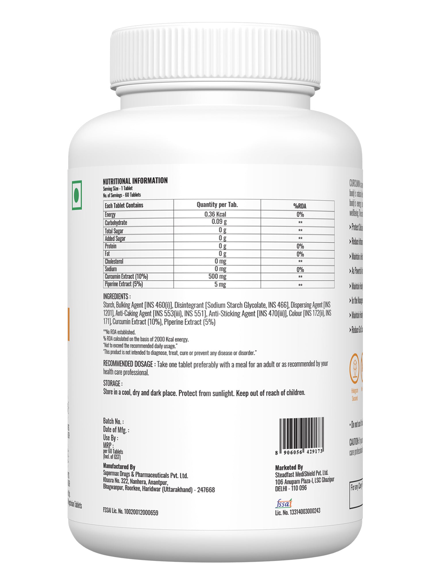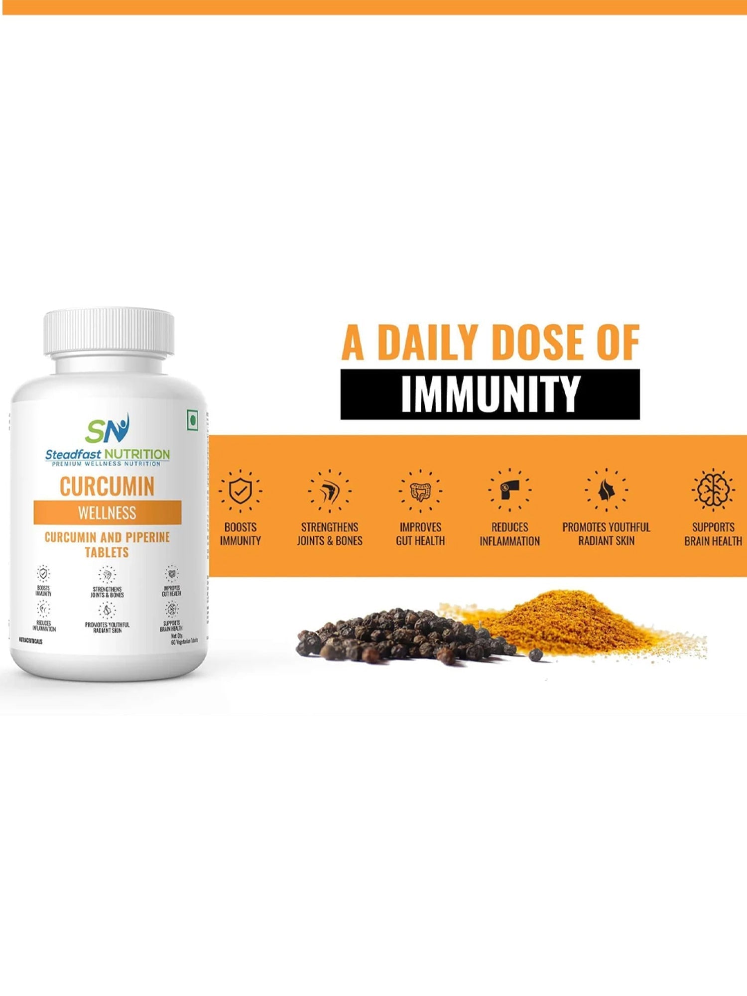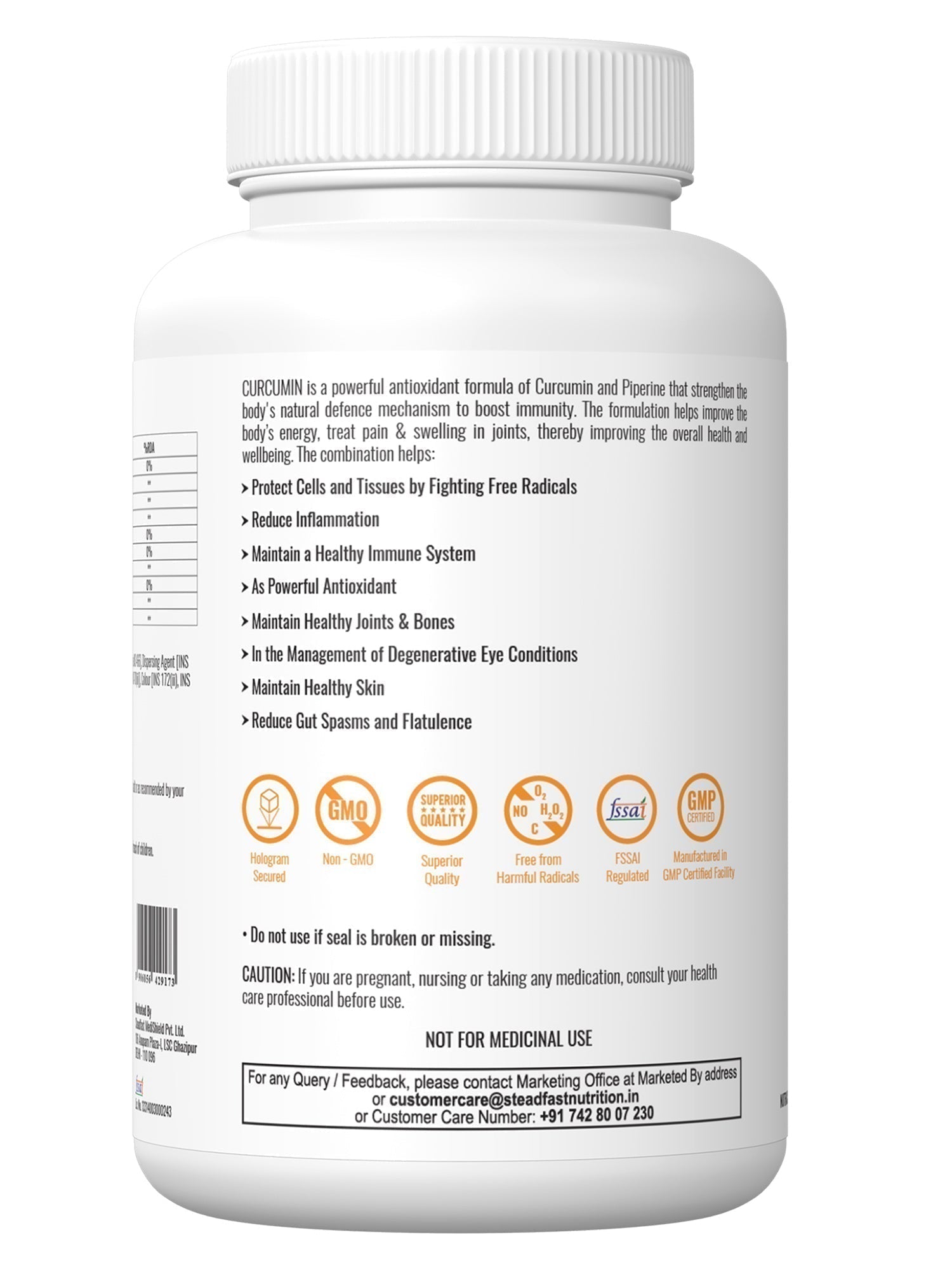 Steadfast Nutrition’s CURCUMIN provides 500 mg of curcumin and 5 mg of piperine, which helps boost immunity, reduce inflammation, improve bone and joint pain, boost skin, heart, and brain health, and maintain gut health.