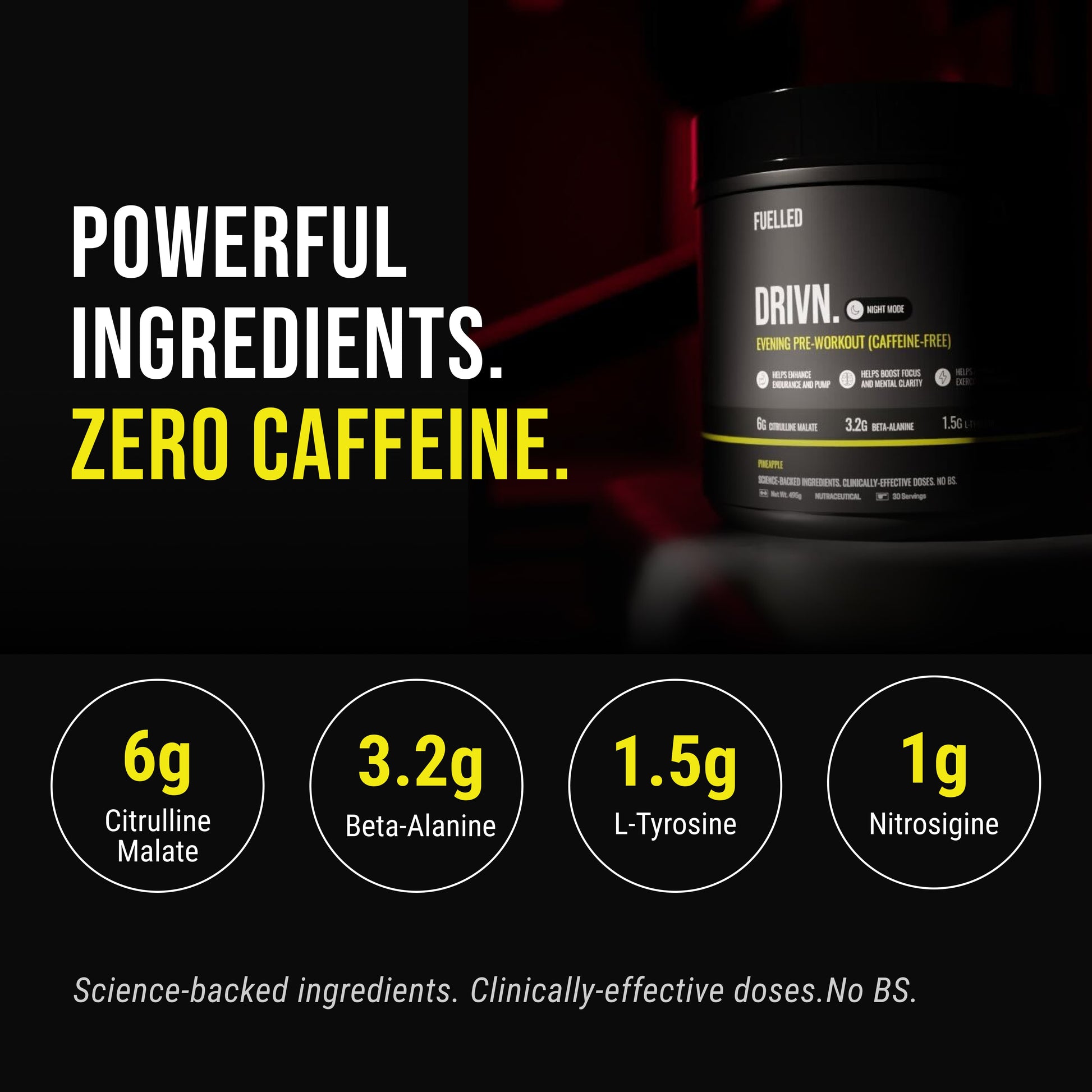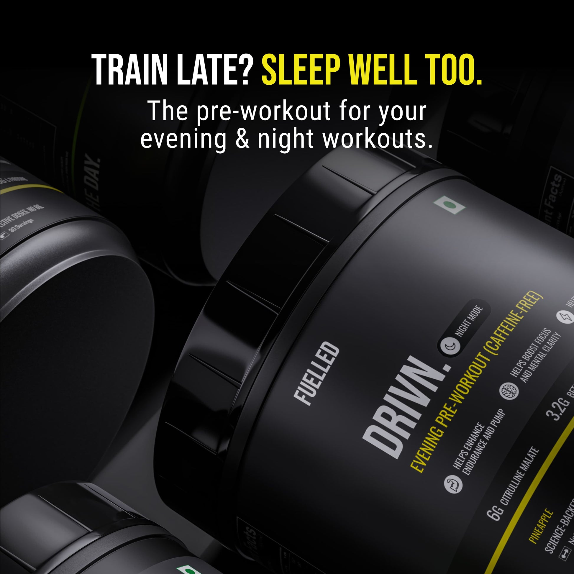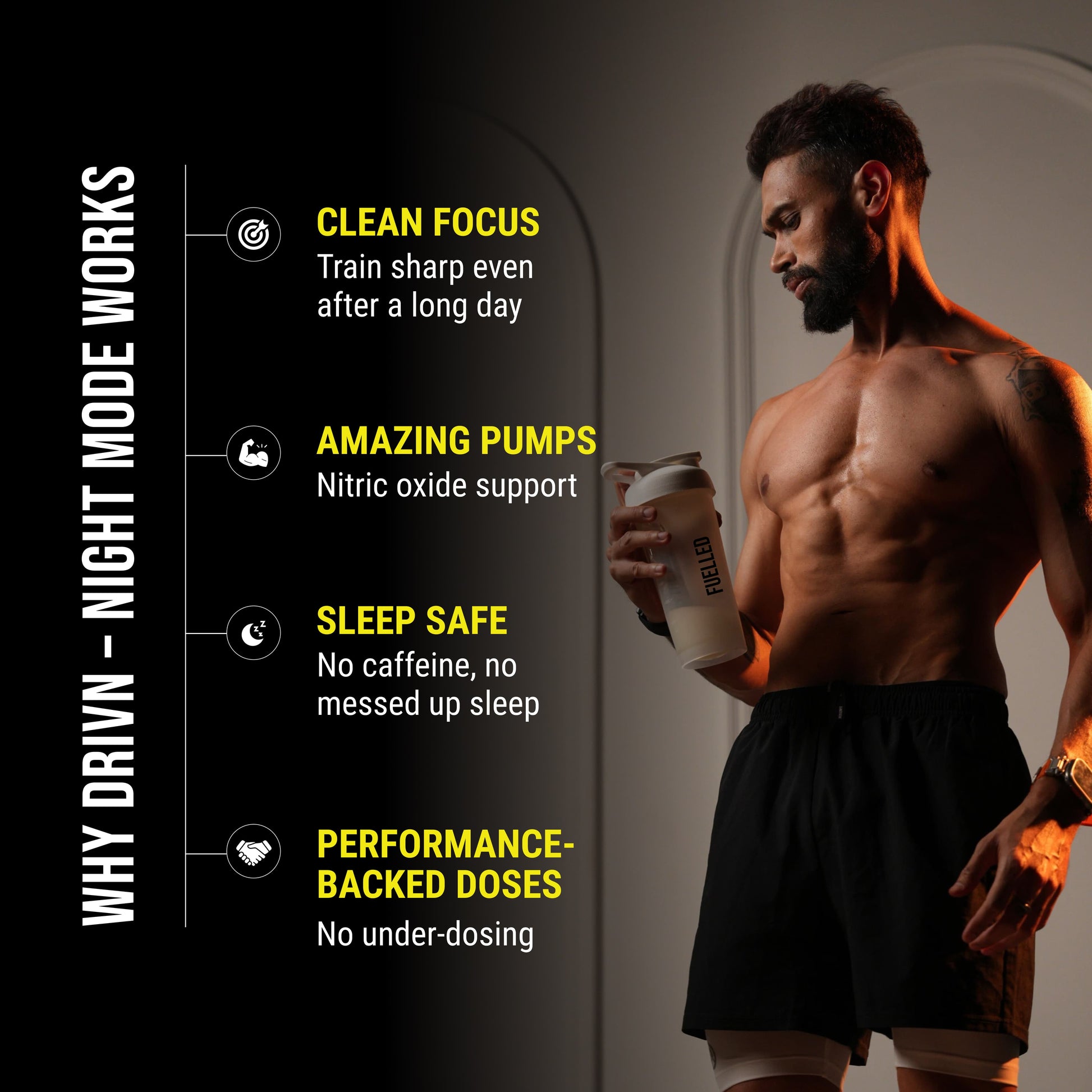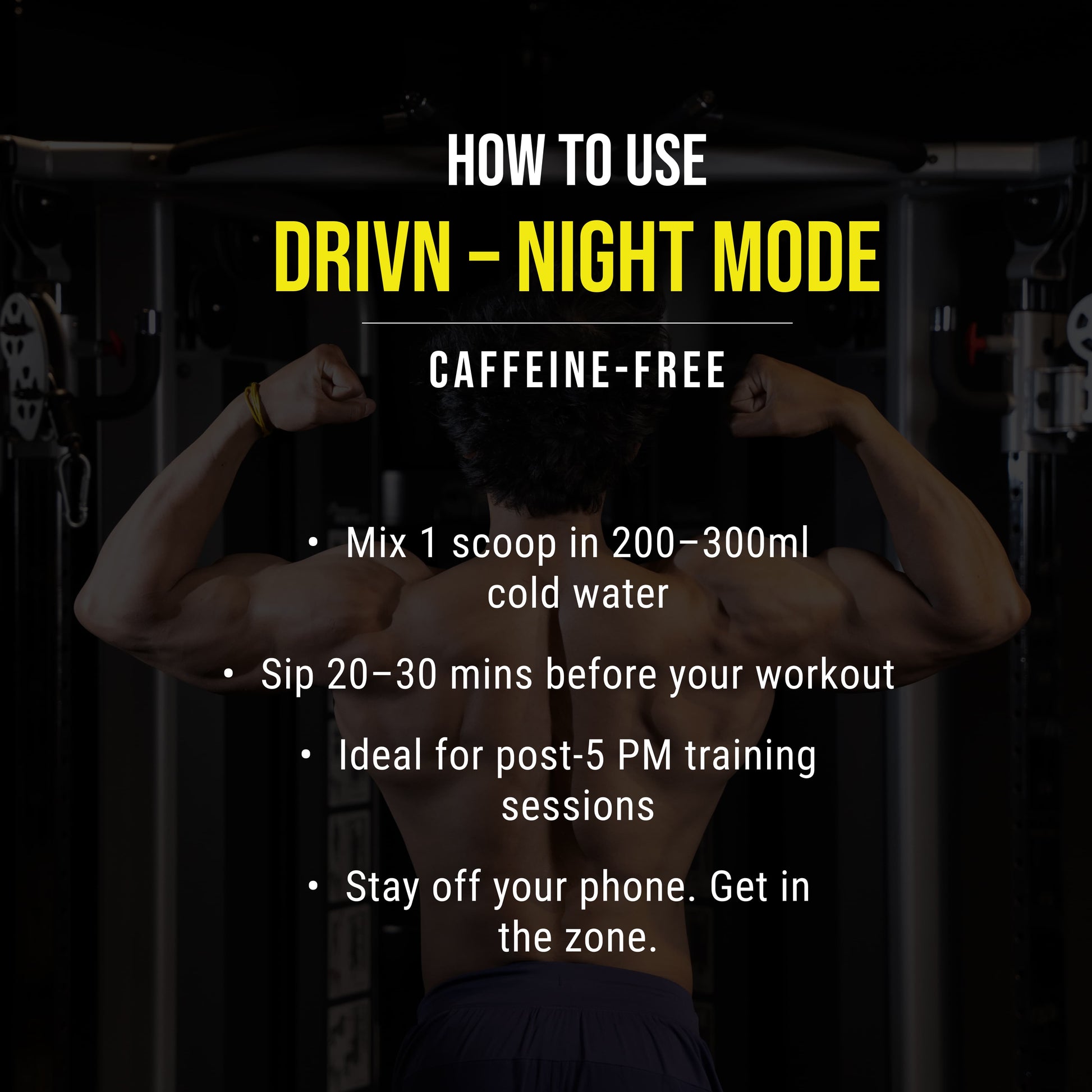 DRIVN – Night Mode is made for evening and night workouts. It helps you lift better and stay focused—without caffeine. Great pumps, intense focus, better endurance—all with zero impact on sleep.