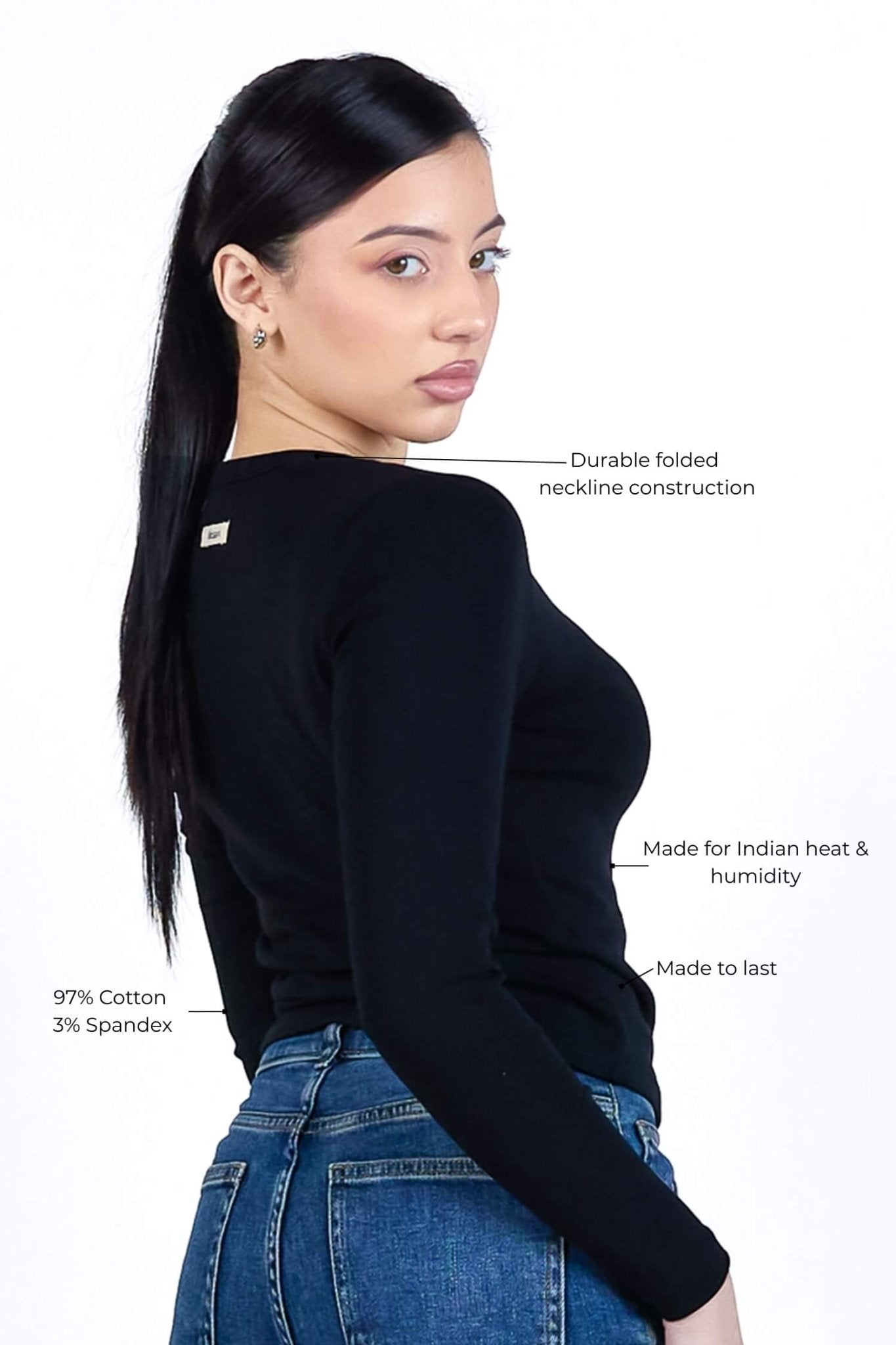 Why You Need This Long sleeves, minus the drama. It’s soft, stretchy, and feels like your skin but smoother. Whether you’re in freezing AC or braving a breezy evening, this tee’s got your back (and arms).