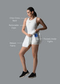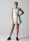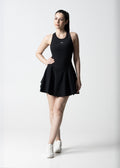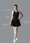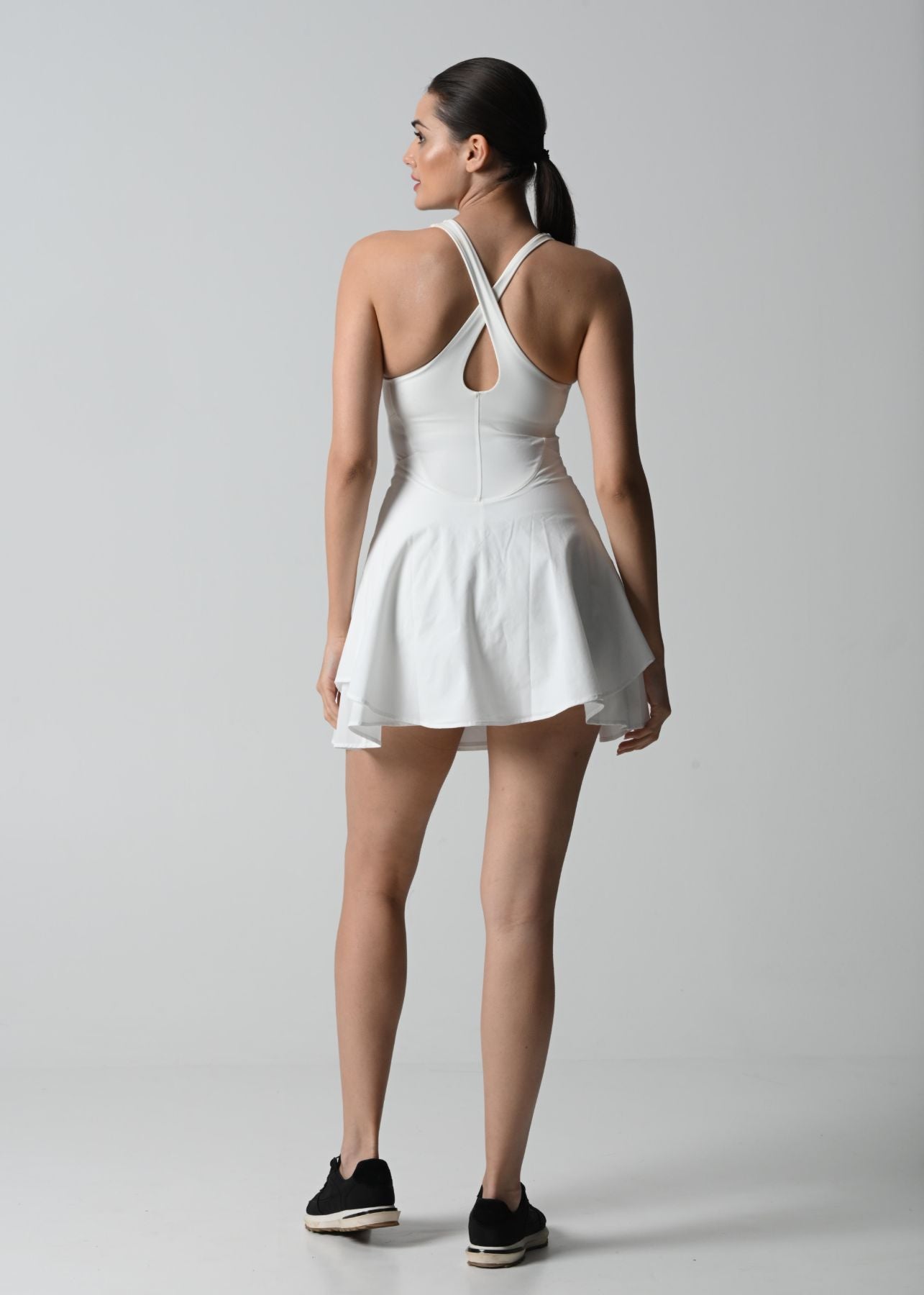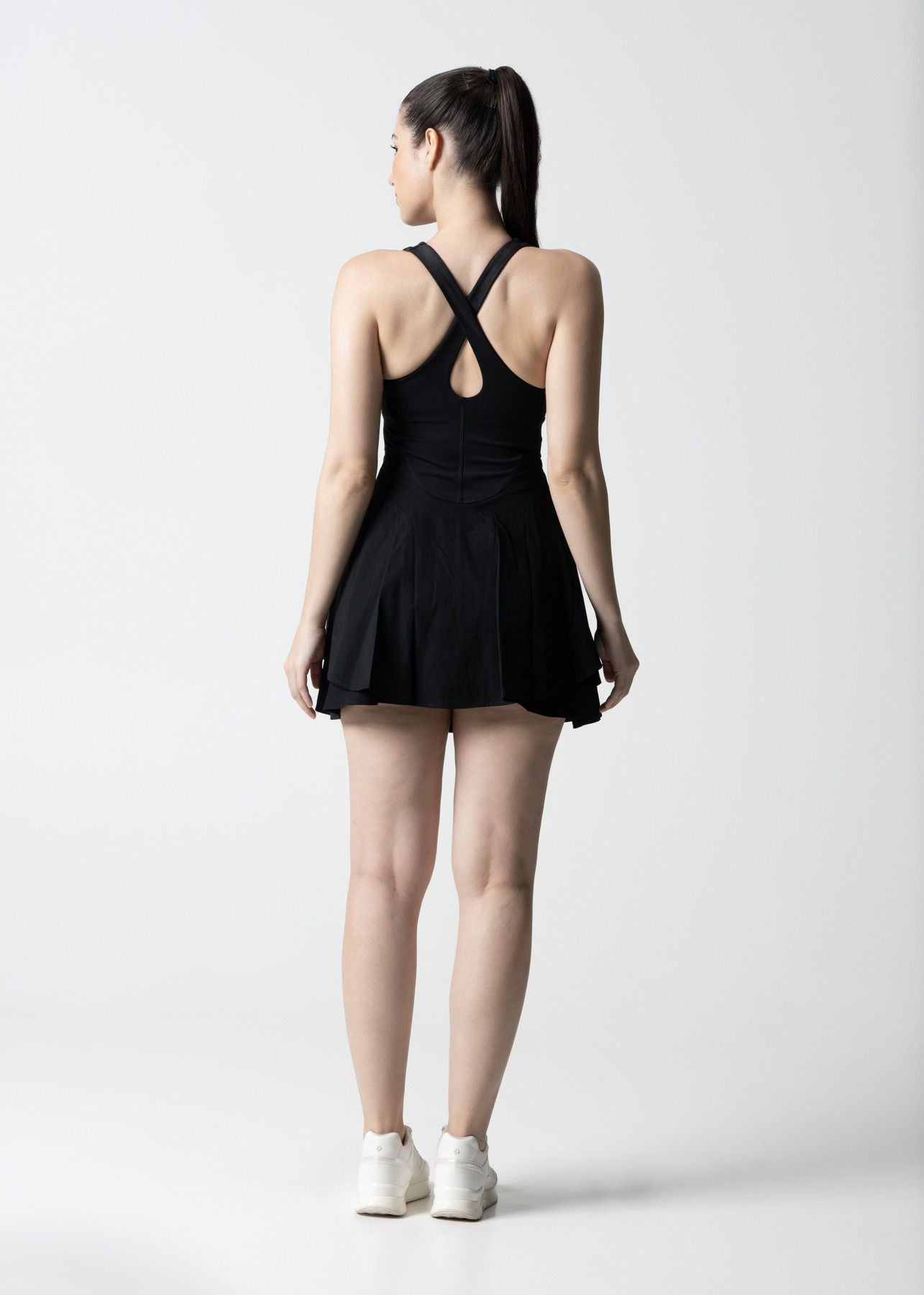 Own the court and the streets with this ultra-functional yet fashion-forward active dress. Designed with a flared silhouette, it flows with every movement while giving a flattering, feminine shape. Built-in tights provide comfort, coverage, and confidence—complete with pockets to stash essentials like tennis balls, keys, or cards during play. The criss-cross back not only elevates the look but allows for full upper-body mobility, whether you're serving aces or heading out post-session. With removable cups for personalized support and subtle branding for a clean, athletic edge, this is your go-to for performance, versatility, and style—all in one sleek package.