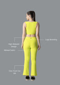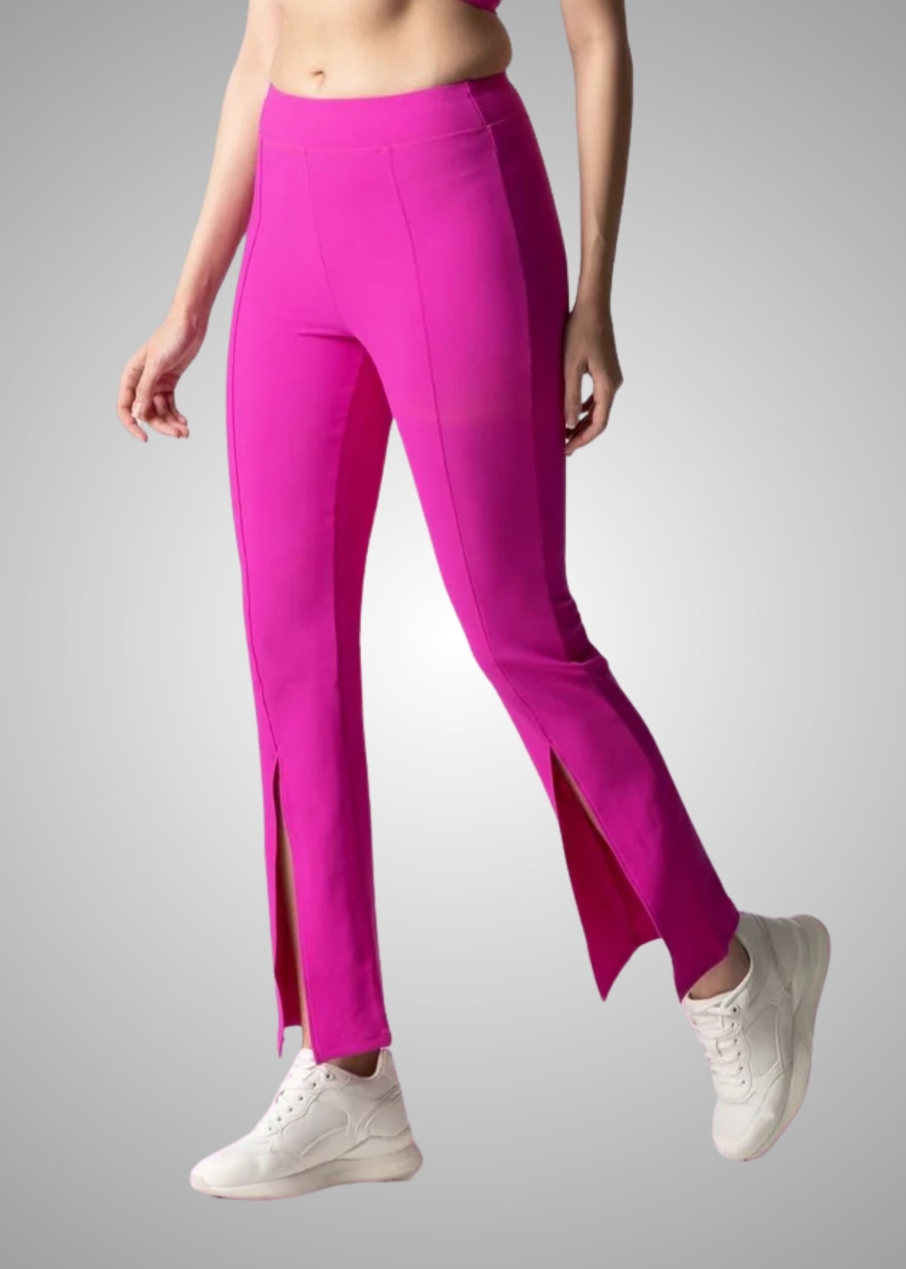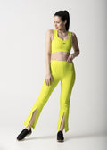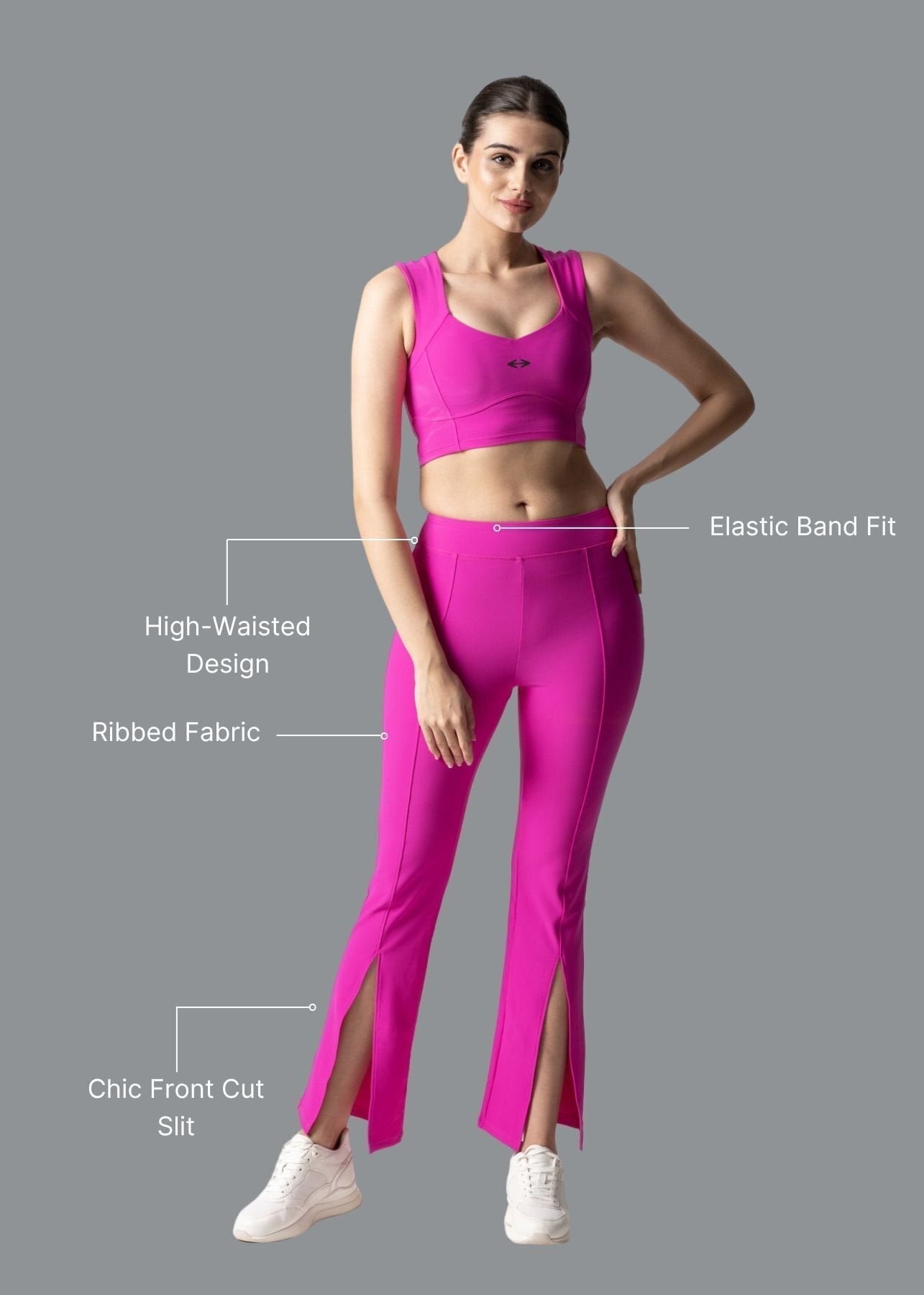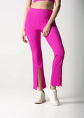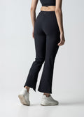 Step into effortless style and all-day comfort with these high-waisted flare pants, designed to elevate your active and casual looks. The high-waisted design offers flattering support and a smooth, contoured silhouette, while the elastic waistband ensures a snug, stay-put fit that moves with you. A chic front cut slit adds a contemporary edge, perfectly balanced by the elegant flared bottom that elongates your frame. Made from soft ribbed fabric, these pants provide just the right amount of stretch and structure. Finished with reflective branding, they blend sporty vibes with modern flair—ready for movement, lounging, or making a statement on the go.