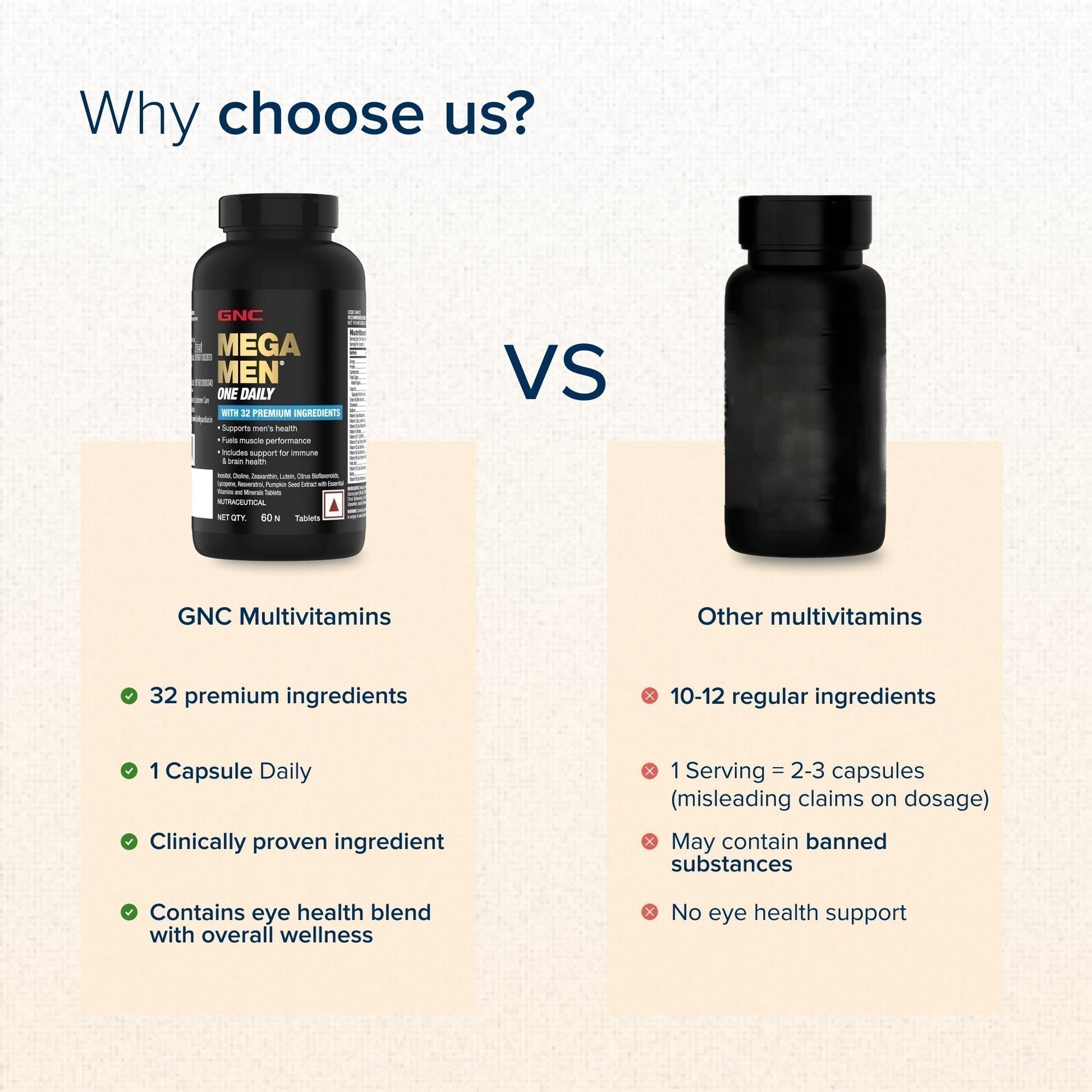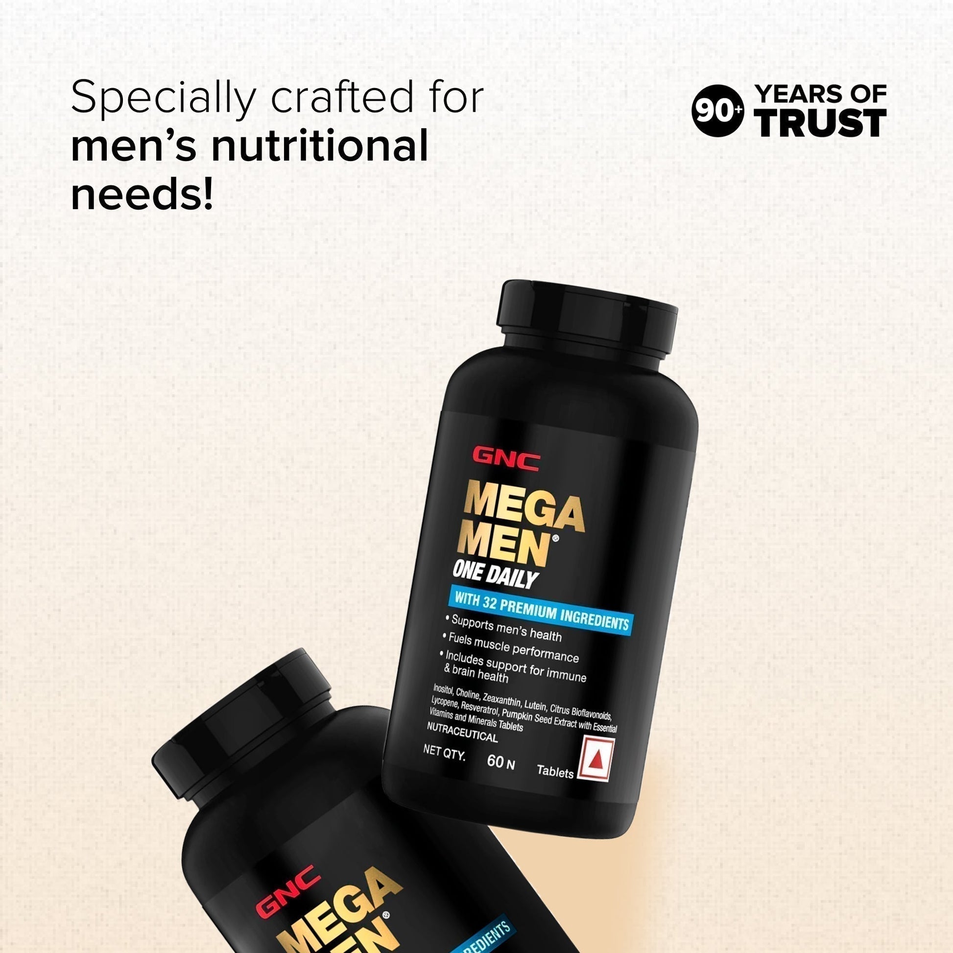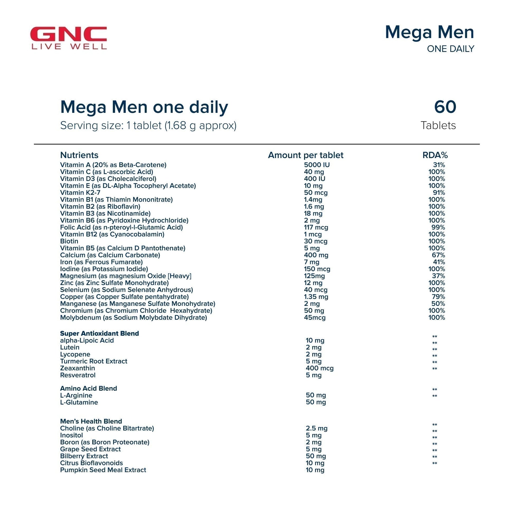 GNC Mega Men One Daily Multivitamin for Men | Promotes Men's Well-Being | Supports Muscle Function | Boosts Immunity | Improves Memory & Focus | Formulated In USA | 32 Premium Ingredients | 60 Tablets