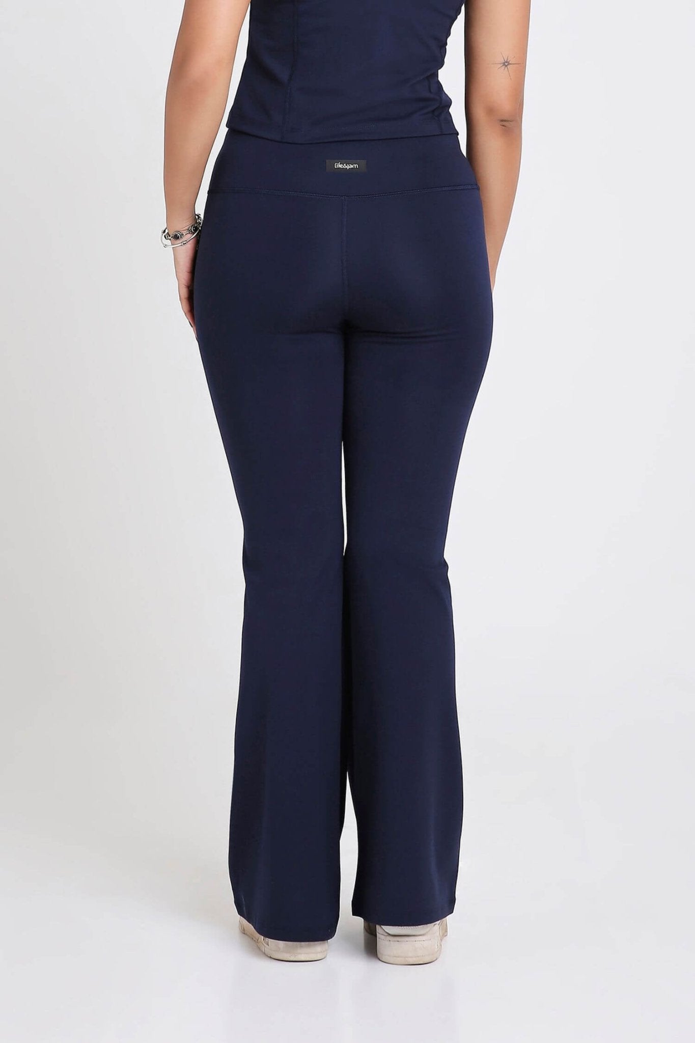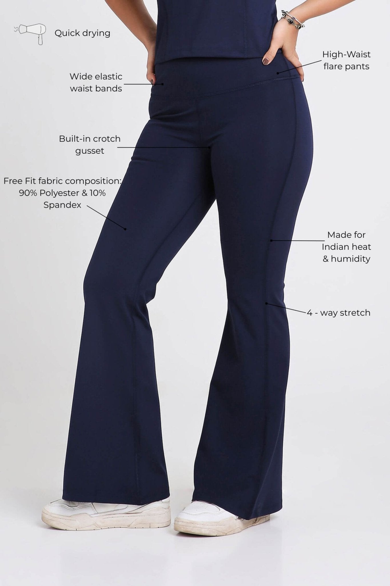 No Returns  Why You NEED This: Flattering, flowy, and effortlessly cool—the Good Girl Code Flare Pants are designed to move with you. With a high-waist fit, a wide elastic waistband, and a soft, sculpting silhouette, these pants keep you comfortable while elevating your look. Made from quick-drying, 4-way stretch Free Fit fabric, they’re breathable, non-sticky, and built to handle Indian heat & humidity.