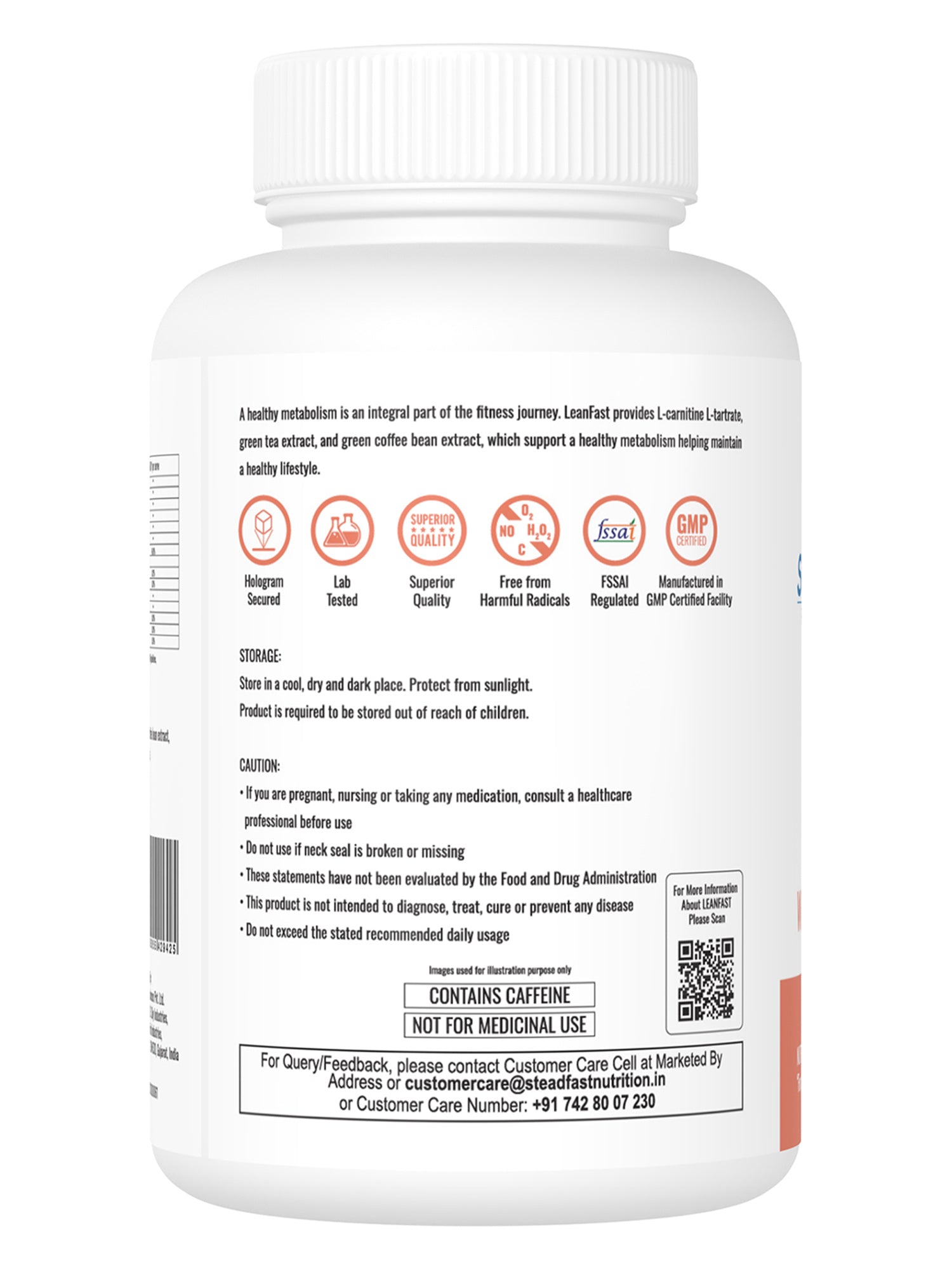 No Returns  Steadfast Nutrition’s LeanFast is the perfect supplement for athletes who want to burn calories and individuals aiming at losing excess fat. A tablet of LeanFast provides L-Carnitine L-Tartrate, Green Coffee Bean Extract, Green Tea Extract, Caffeine Anhydrous, Coleus Extract, Black Pepper Extract, and Chromium that help in weight loss by promoting fat oxidation and regulating glucose metabolism, which improves the body’s overall metabolism and helps burn calories.