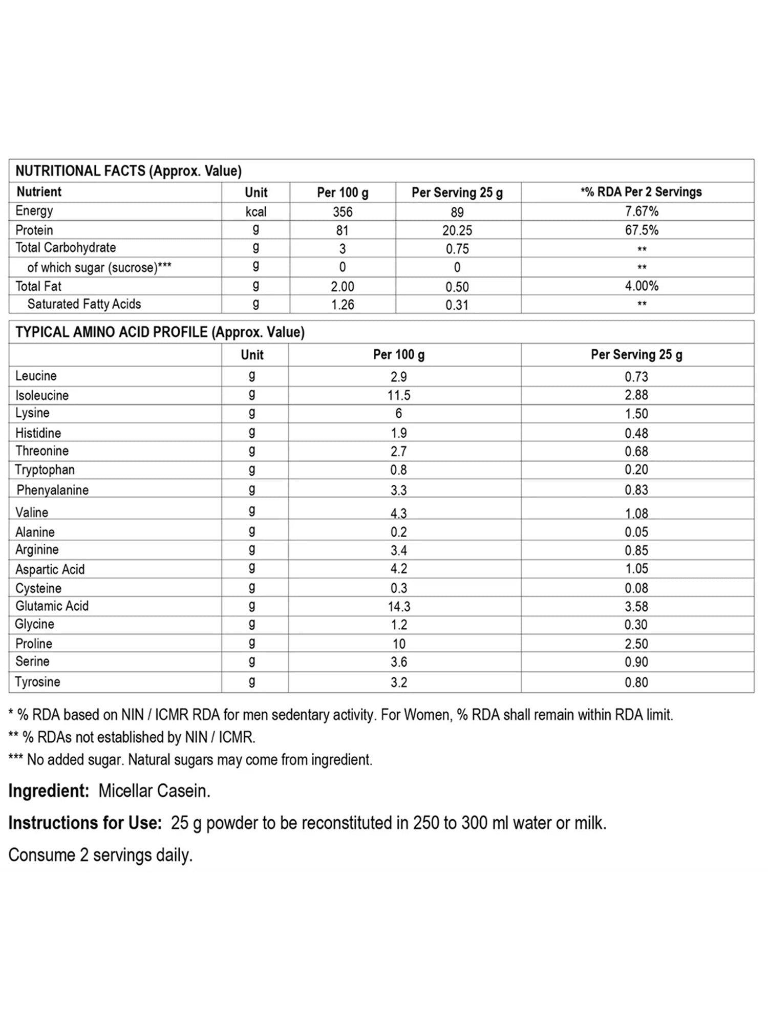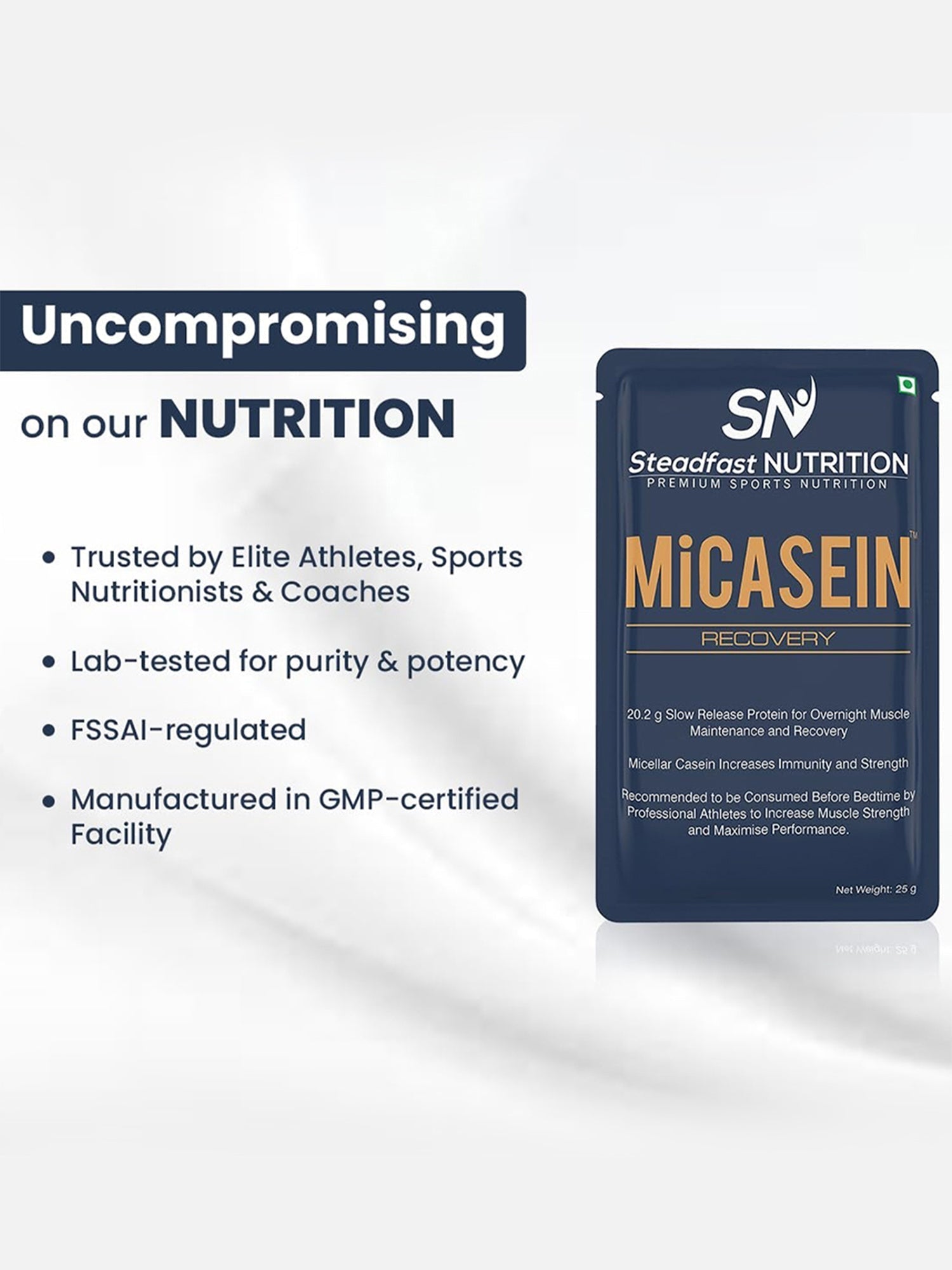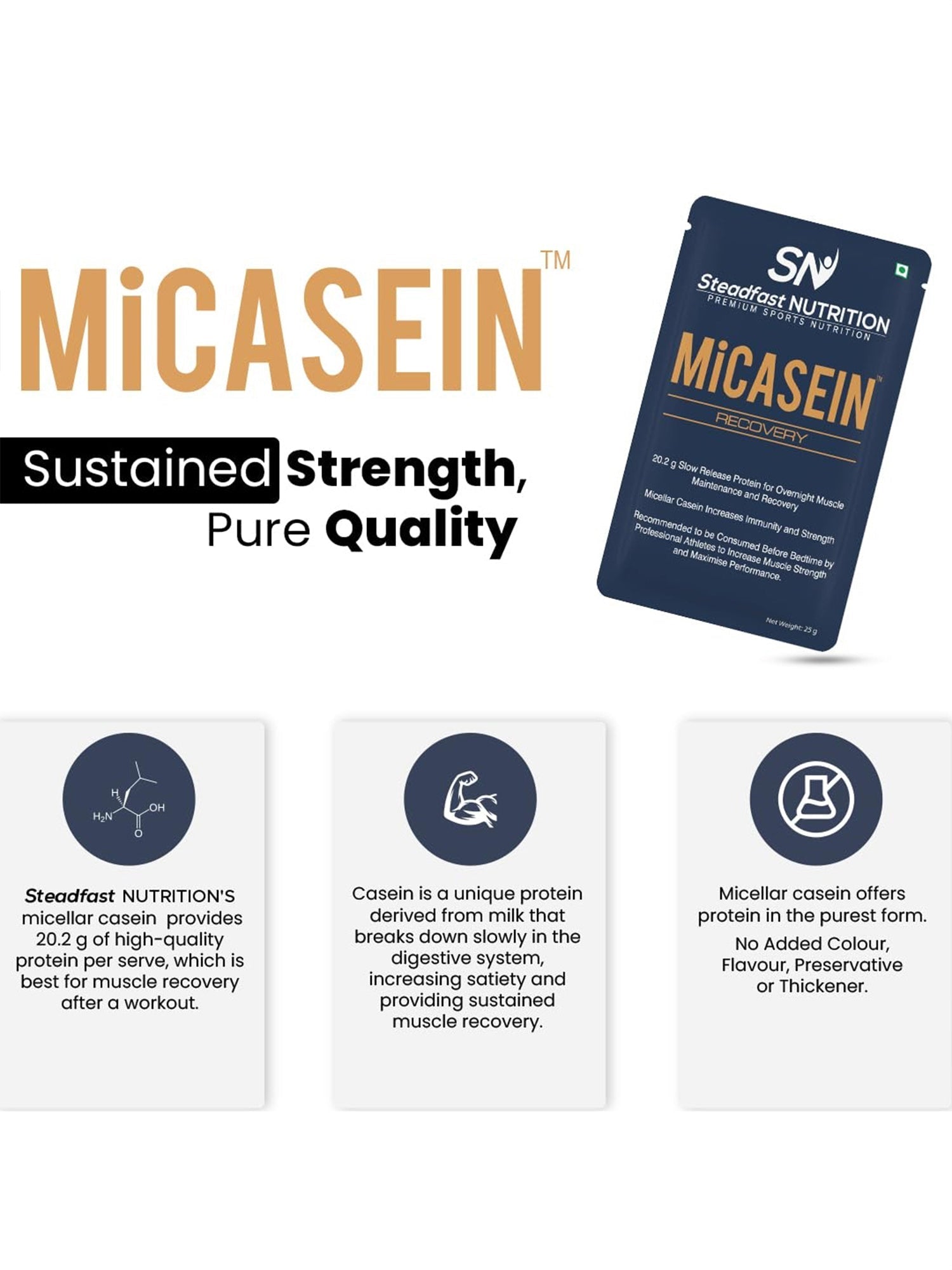 MiCasein is a protein obtained from Micellar Casein, which provides a steady and gradual release of amino acids for overnight recovery. Once consumed, MiCasein forms micelles in the stomach, which enables the digesting enzymes to work on them slowly, gradually releasing amino acids.