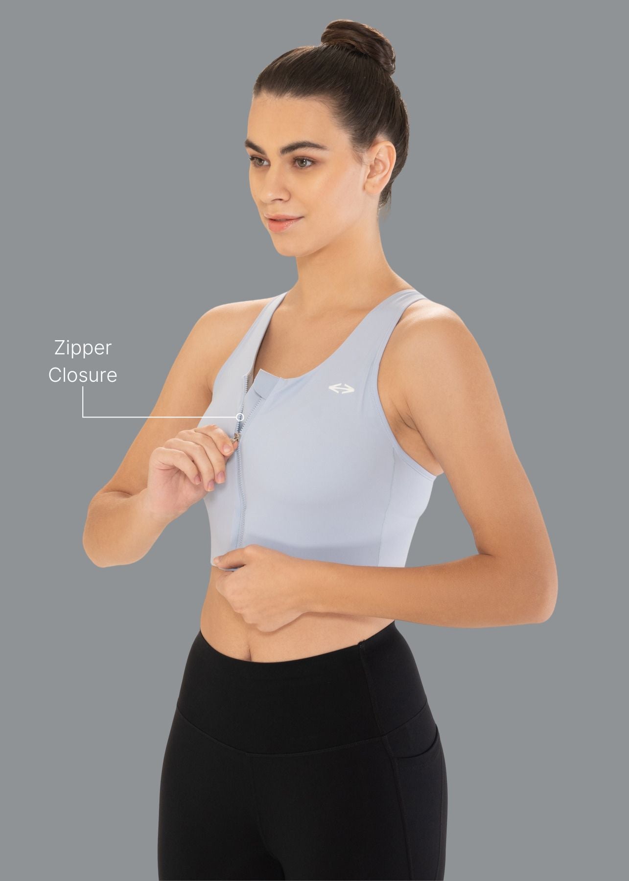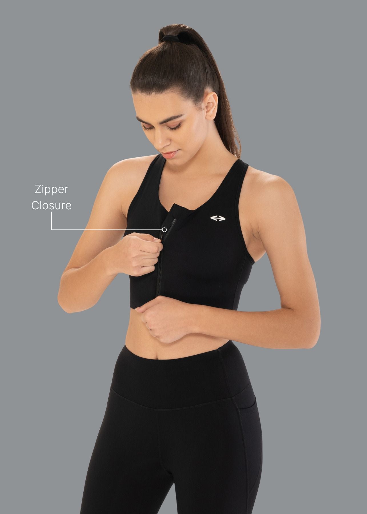 This sports bra is designed for optimal comfort and style, featuring a zipper closure for easy on-and-off convenience and adjustable back and shoulder straps for a personalized fit. Its body-fit design provides a flattering silhouette, while the full-coverage support ensures security during high-impact activities like running or training. With a slightly longer length, it offers a modern, stylish touch to your activewear wardrobe, making it both functional & fashionable.