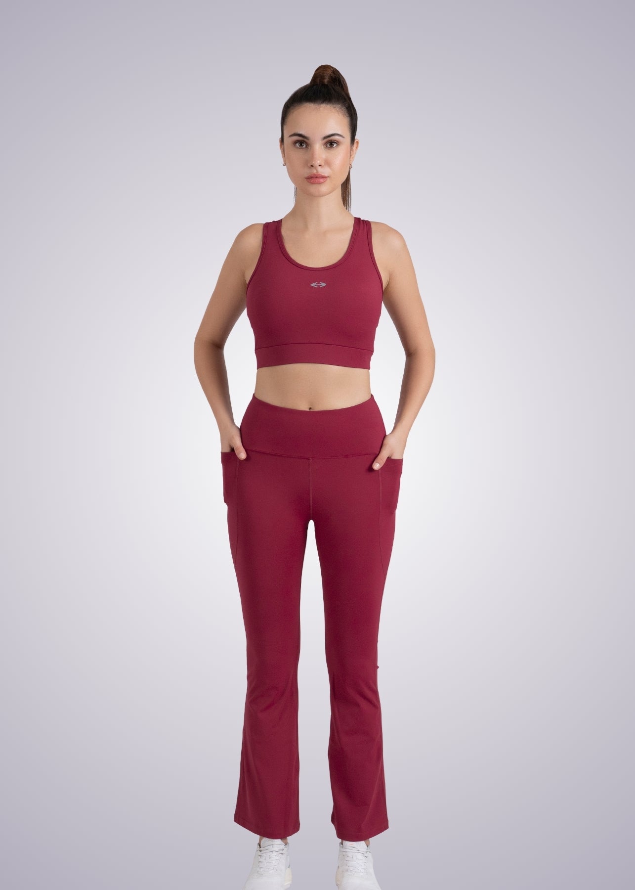 Stride confidently in our high-rise pants, designed for comfort and agility with extra stretch. Lightweight and breathable, they transition seamlessly from workouts to work. The no-roll waistband and side pocket add convenience, while the flare from knee to hem brings style to every step. Step into comfort and style with our women's leggings, perfect for yoga, running, gym workouts, zumba, and pilates.