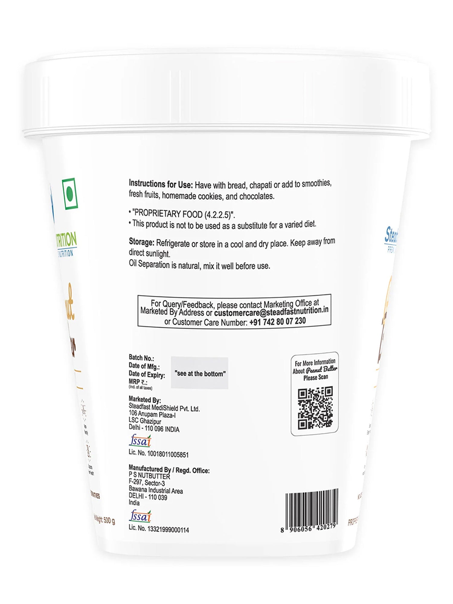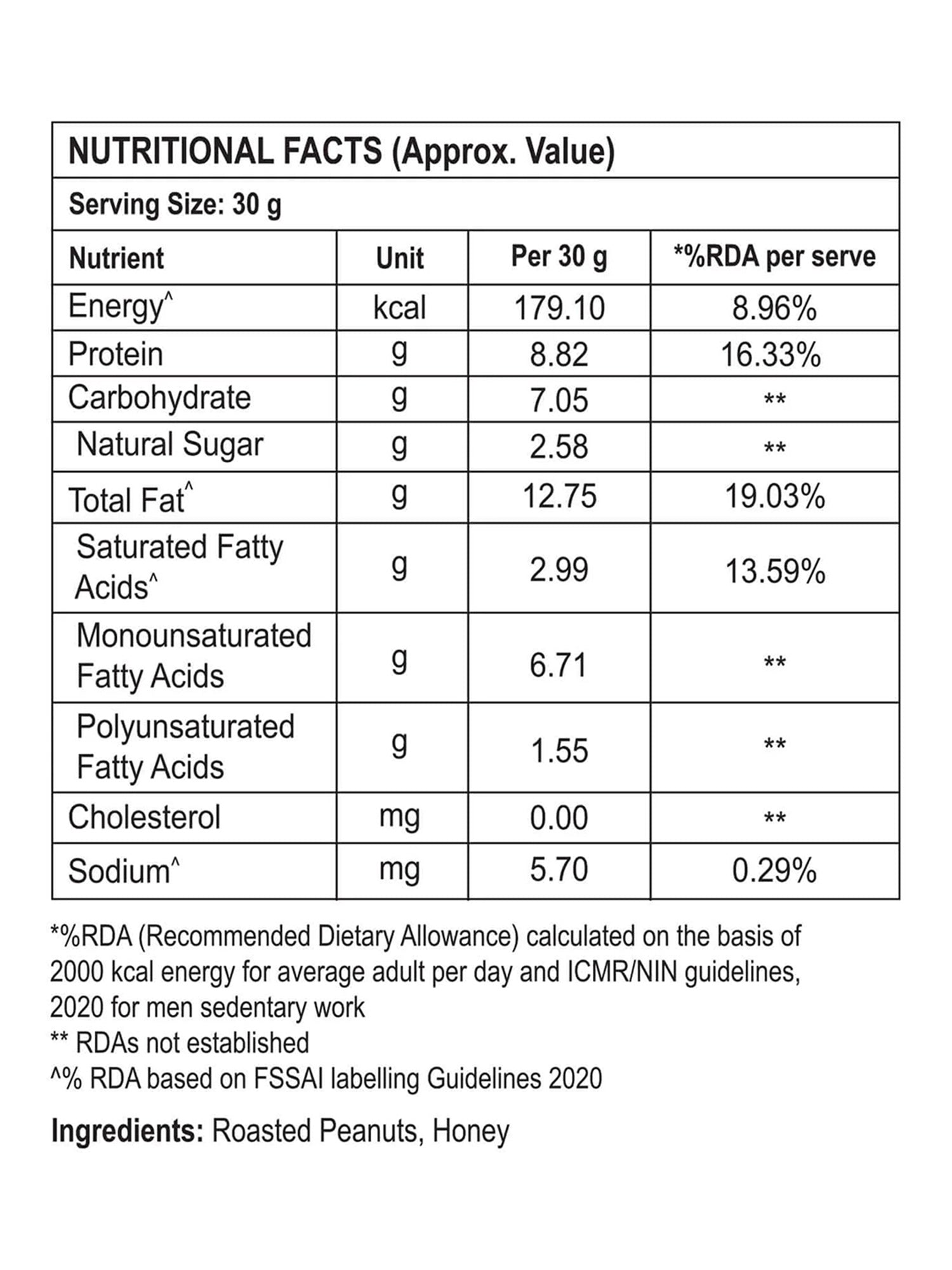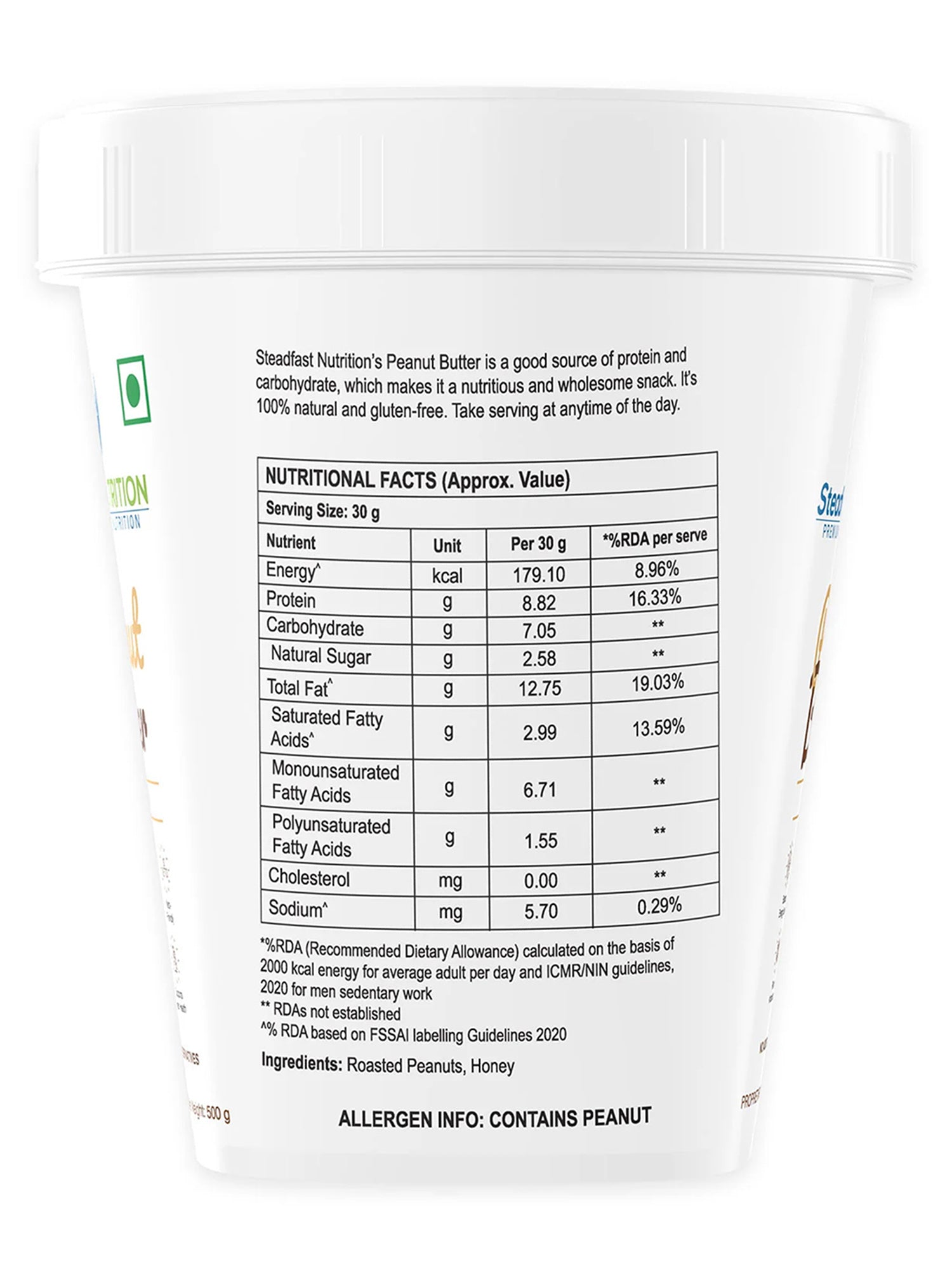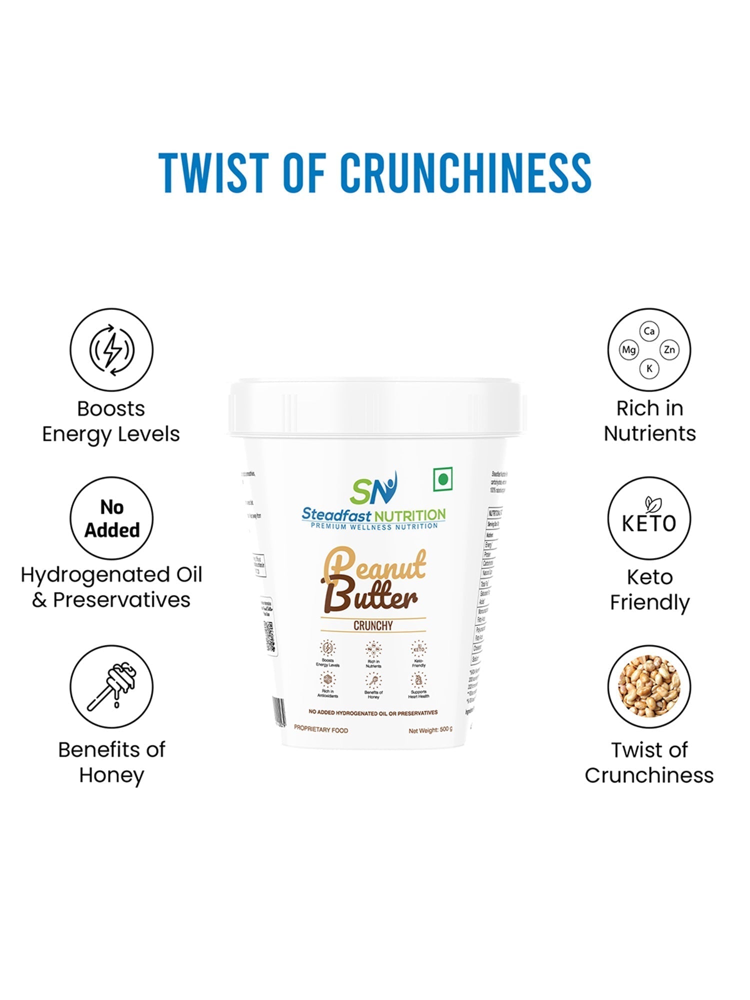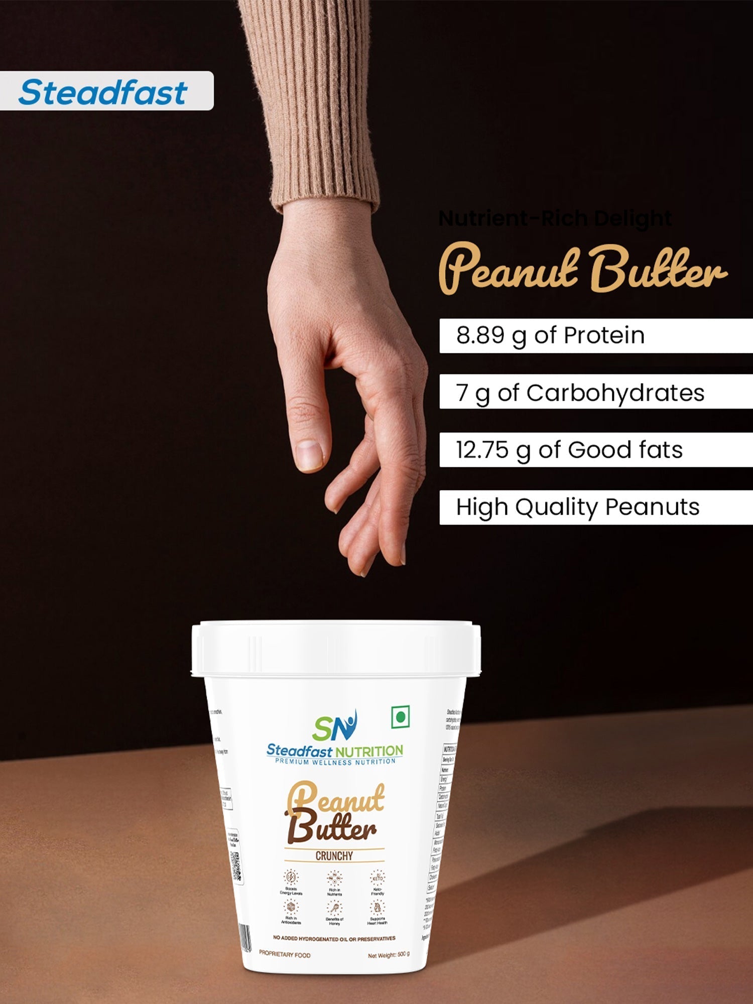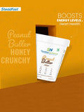 No Returns  Steadfast Peanut Butter Crunchy is a healthy and convenient way to include good proteins, healthy fats, and carbohydrates. It is roasted peanut paste with small pieces of crunchy peanut. Each 30 g serving of Peanut Butter Honey Crunchy contains 12.7 g of good fats, 8.8 g of protein, and 7 g of carbohydrate and is free of added sugar, salt, hydrogenated oil, or preservatives, making it safe for consumption. Peanut Butter is flavoured with delicious honey.