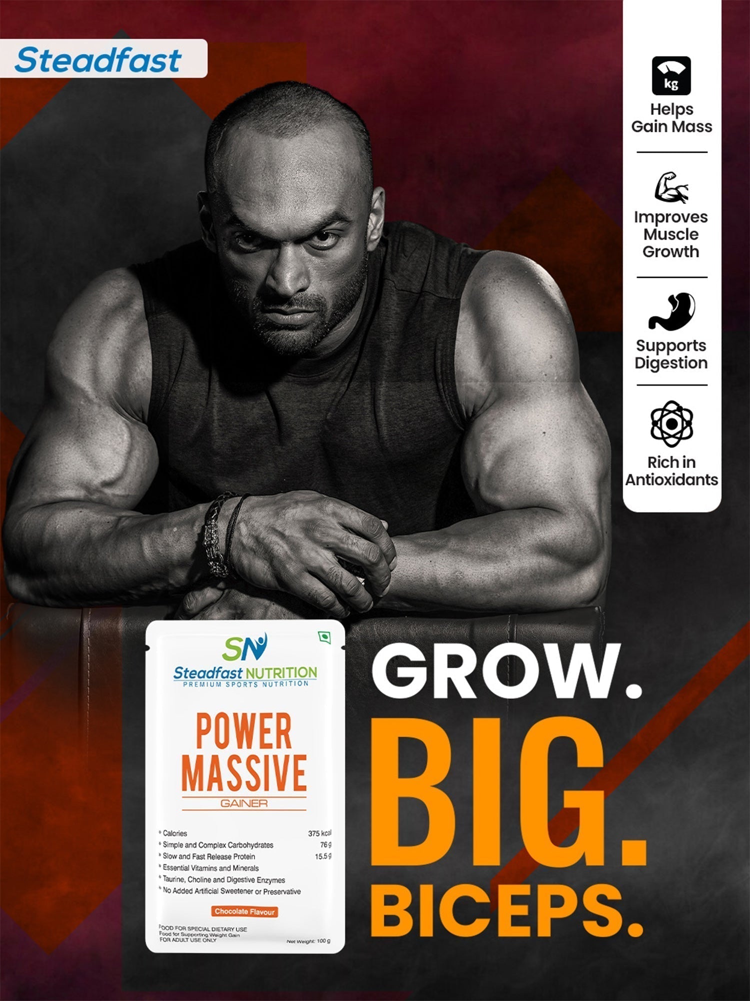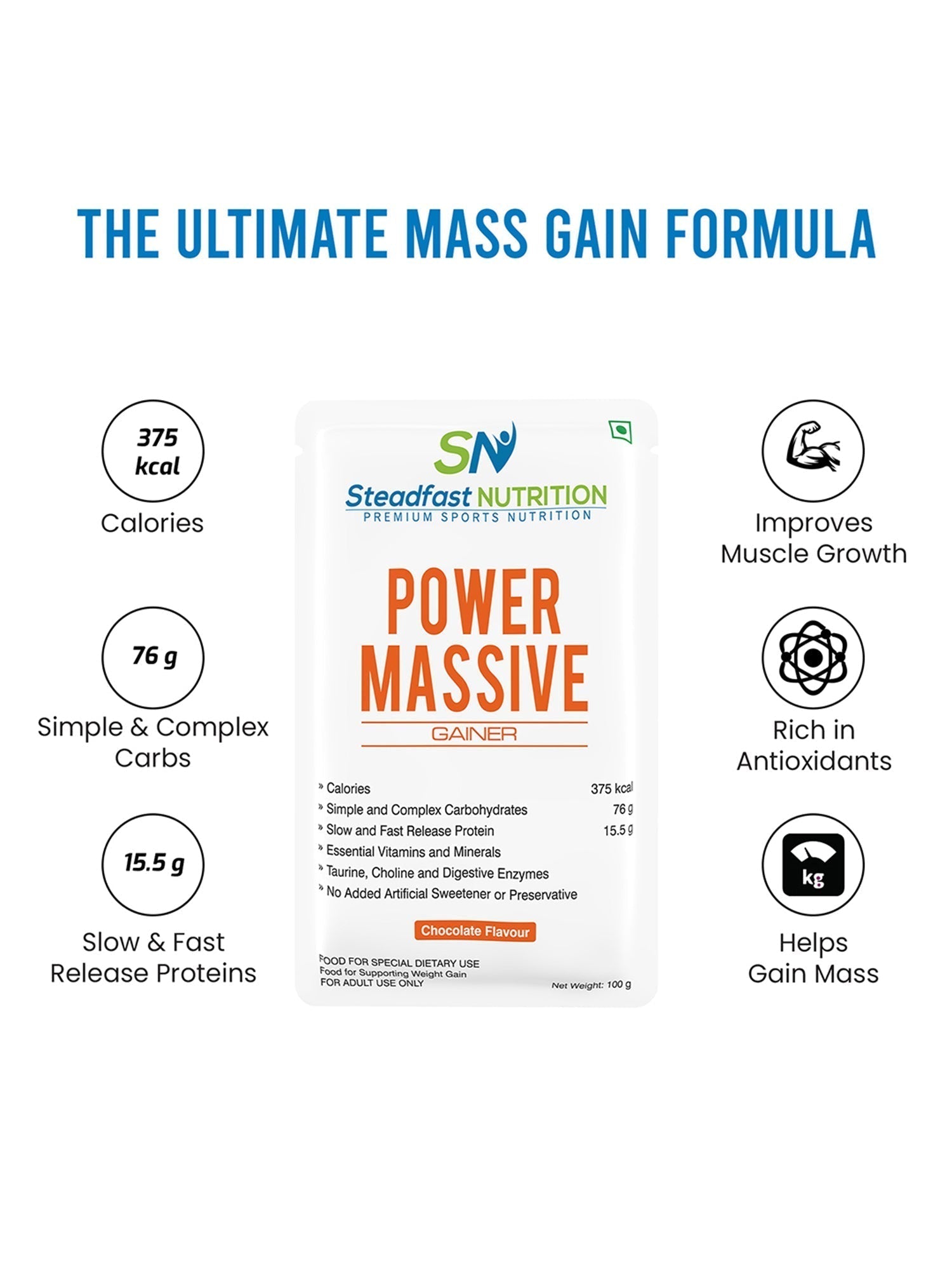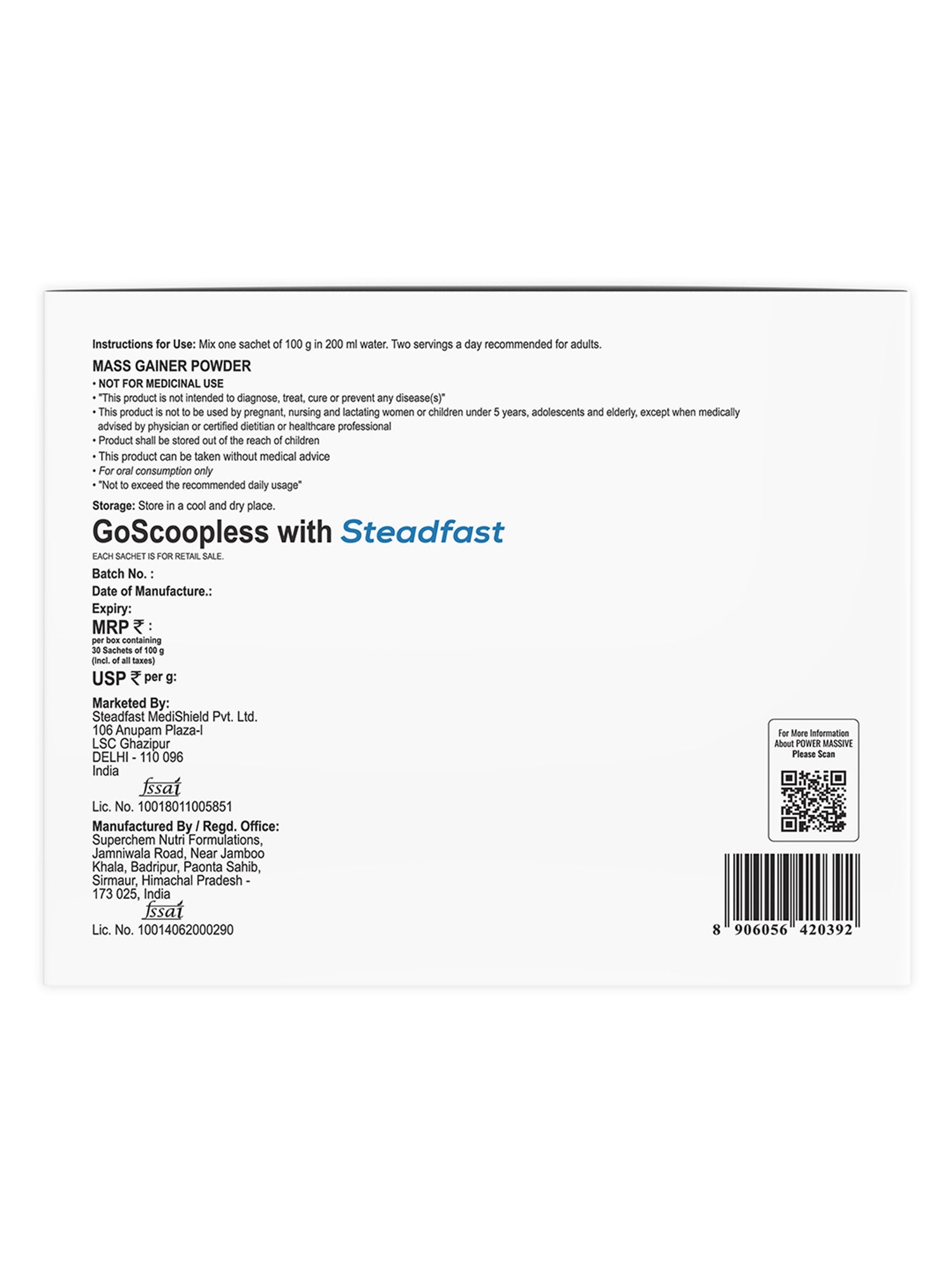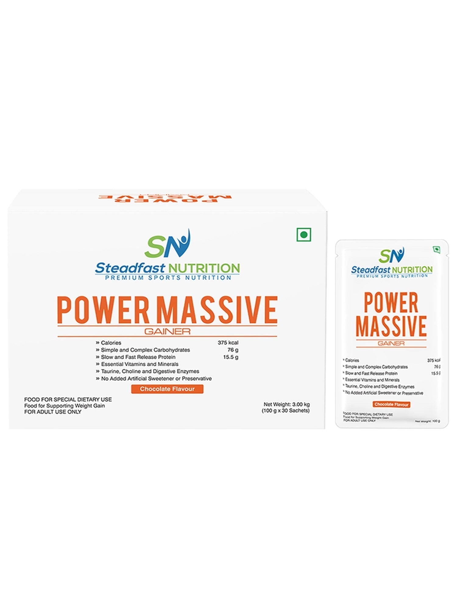 No Returns  When one has a fast metabolism, consumes fewer calories a day, or wants to gain muscle mass and size, one requires lots of nutrients that a food diet may not fulfil- opt for Steadfast Nutrition’s Power Massive, a mass gainer loaded with calories, carbohydrates, protein, essential vitamins, and minerals, which help you bulk up and gain muscle mass and weight. The simple and complex carbohydrates and slow and fast-releasing proteins promote muscle synthesis and repair, and provide instant energy, refilling lost glycogen stores.