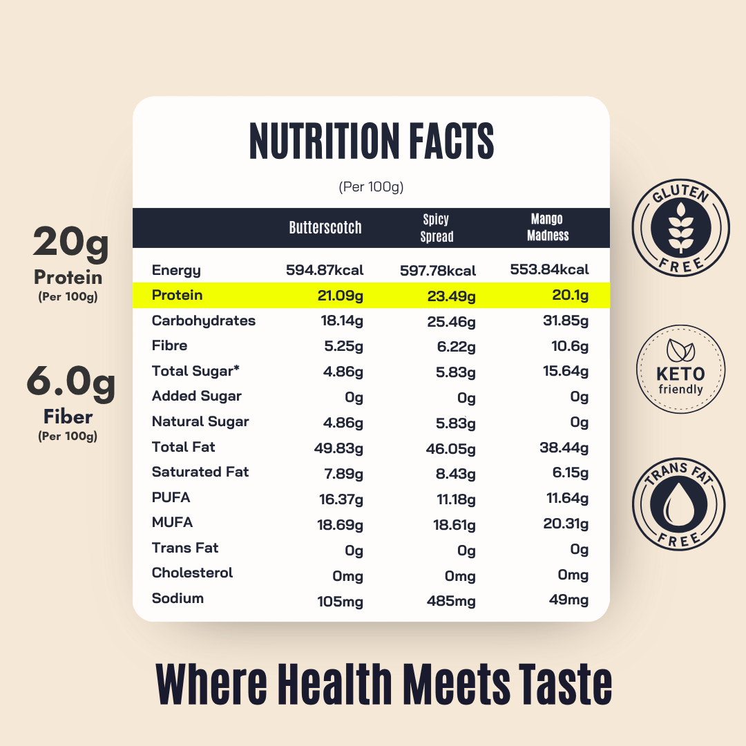 This combo contains one unit each of Butterscotch PB, Spicy Spread PB and Mango Madness PB