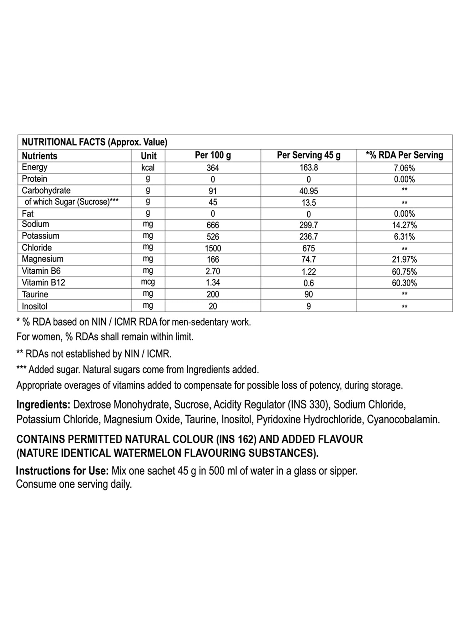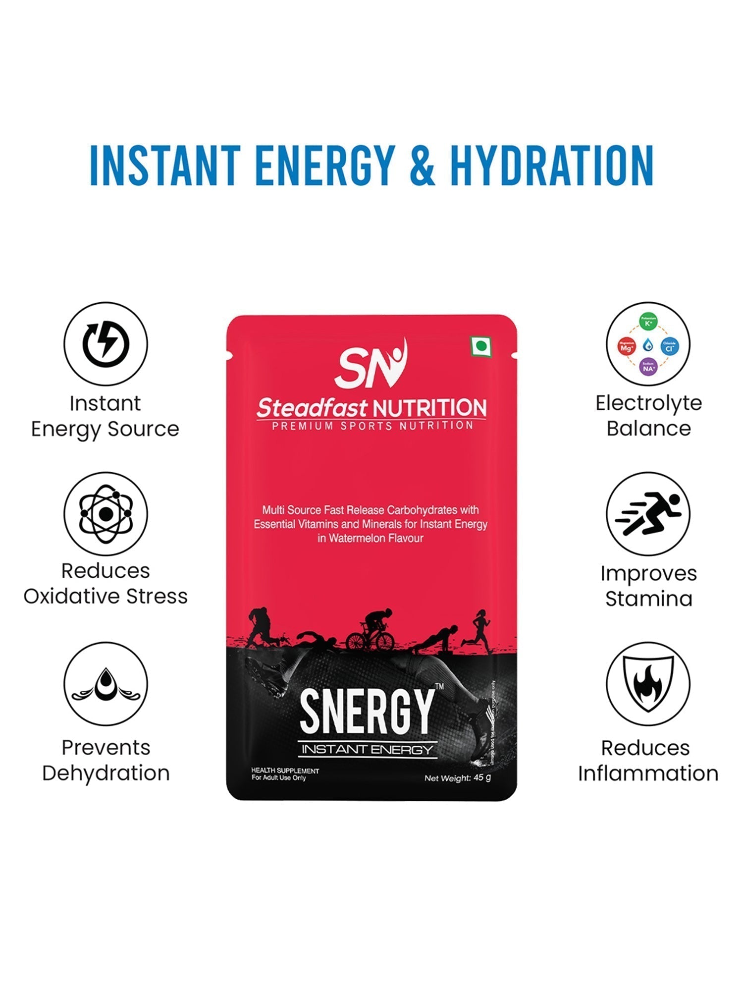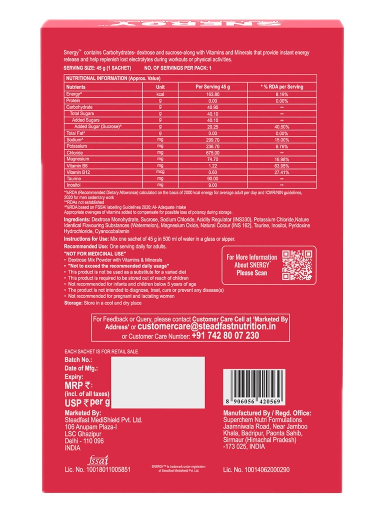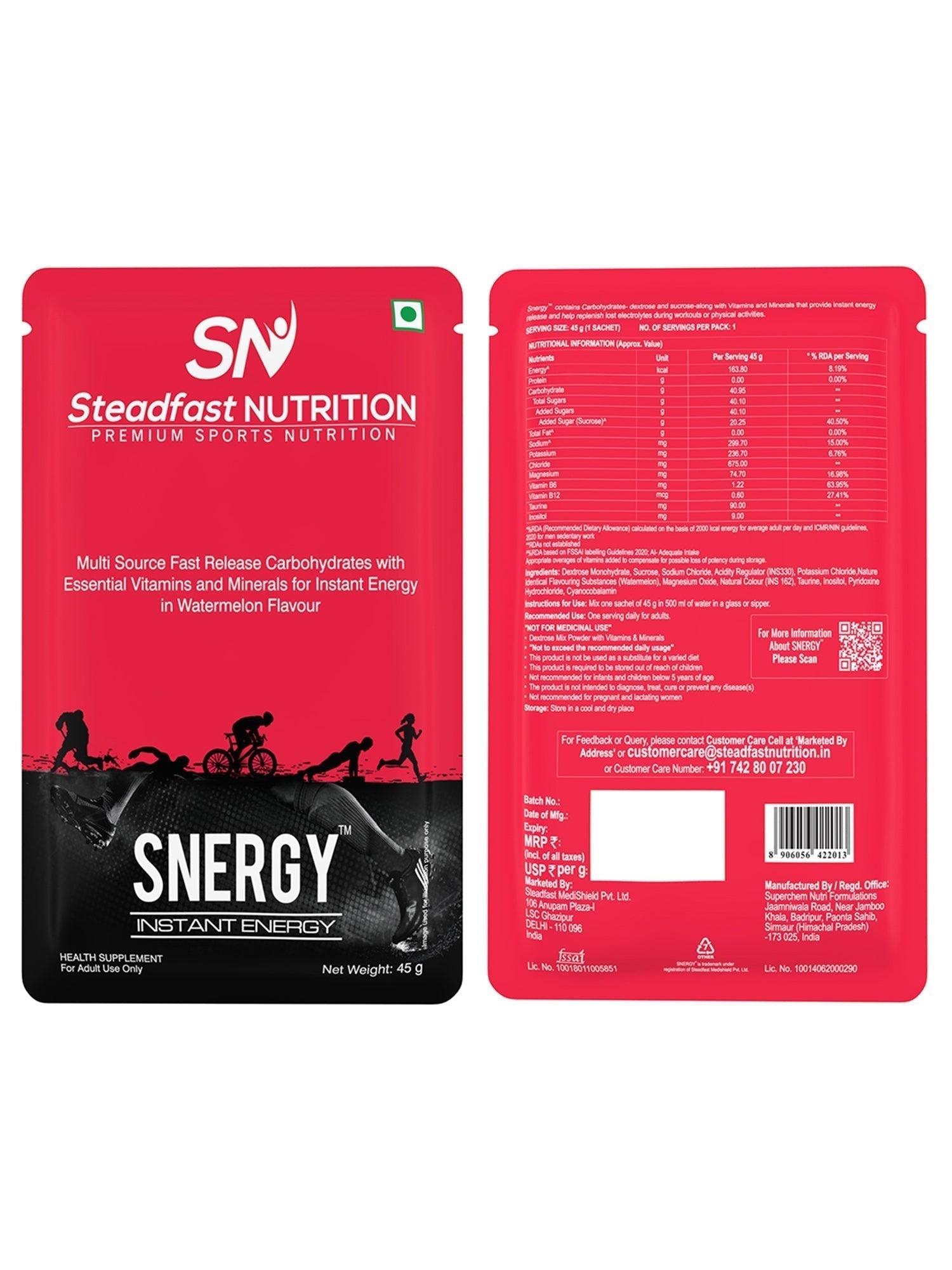 Snergy is a supplement for instant energy and hydration. It contains the simple carbohydrates dextrose and sucrose and essential vitamins and minerals, which give an instant energy boost and replenish lost energy and electrolyte stores. Each 45 g Snergy sachet provides 163.8 Kcal energy. The drink comes in refreshing and delicious orange and watermelon flavours.