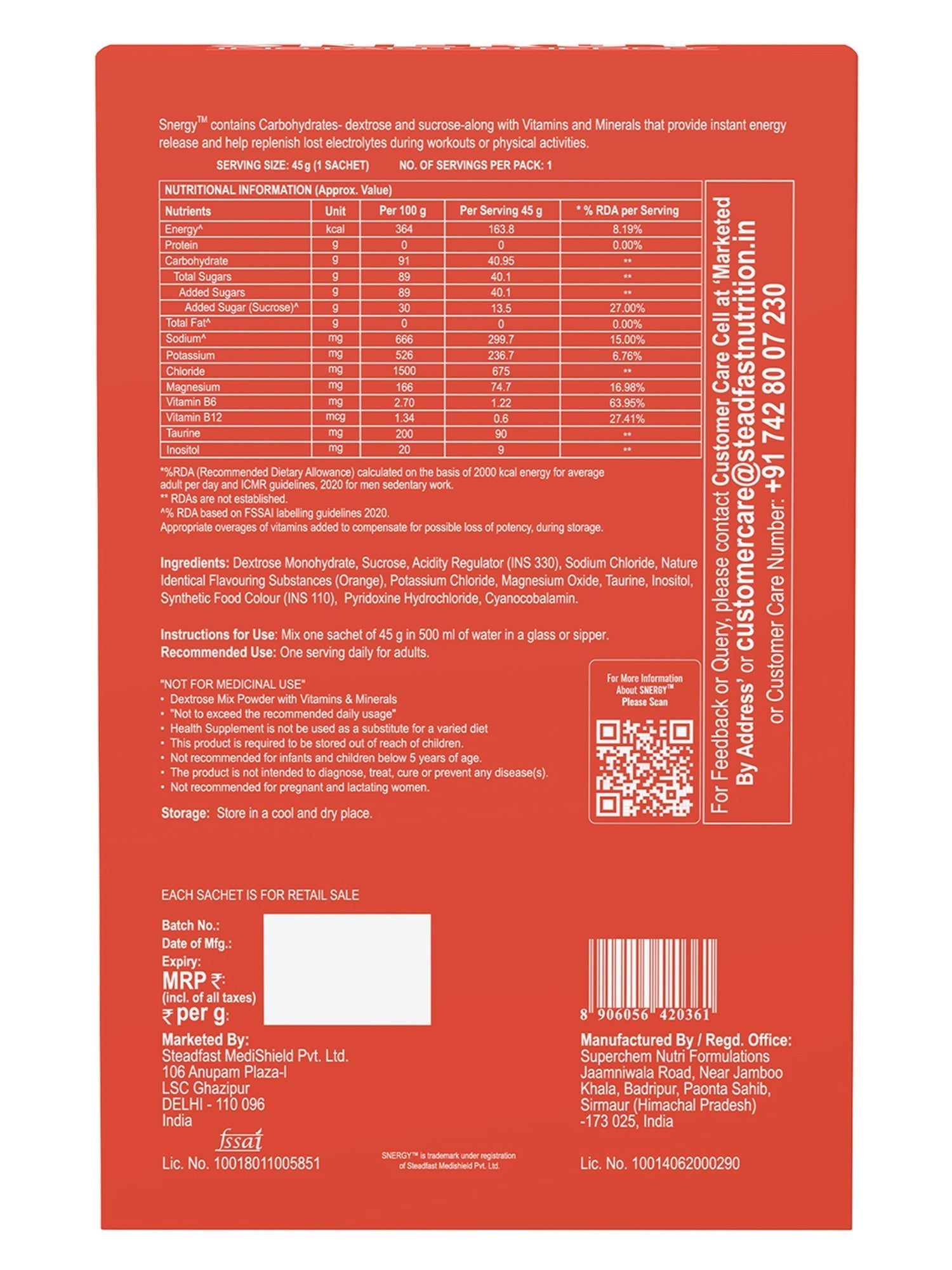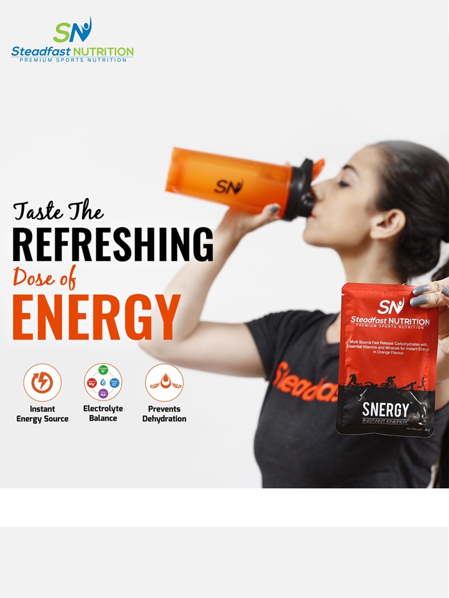 Snergy is a supplement for instant energy and hydration. It contains the simple carbohydrates dextrose and sucrose and essential vitamins and minerals, which give an instant energy boost and replenish lost energy and electrolyte stores. Each 45 g Snergy sachet provides 163.8 Kcal energy. The drink comes in refreshing and delicious orange and watermelon flavours.