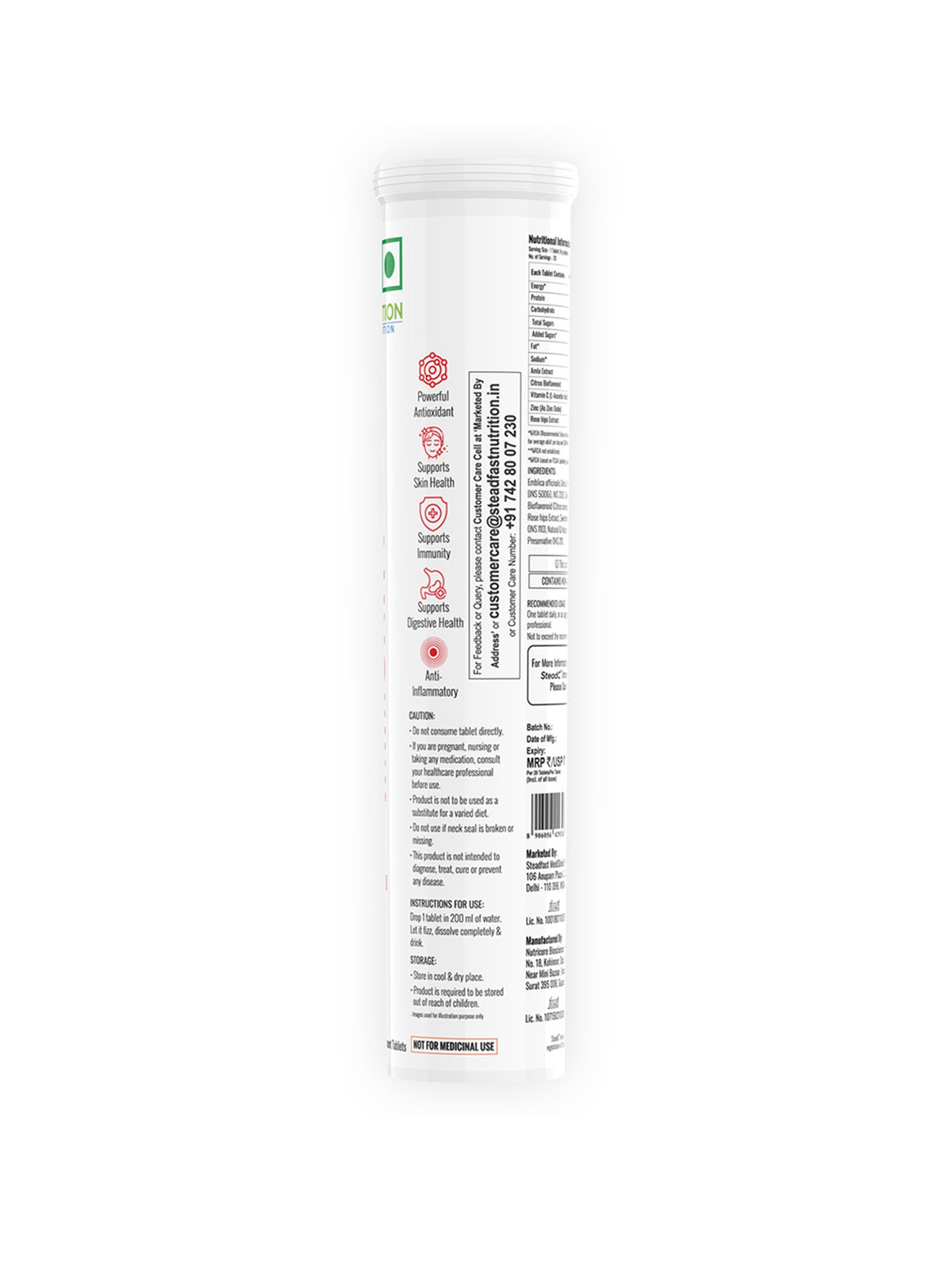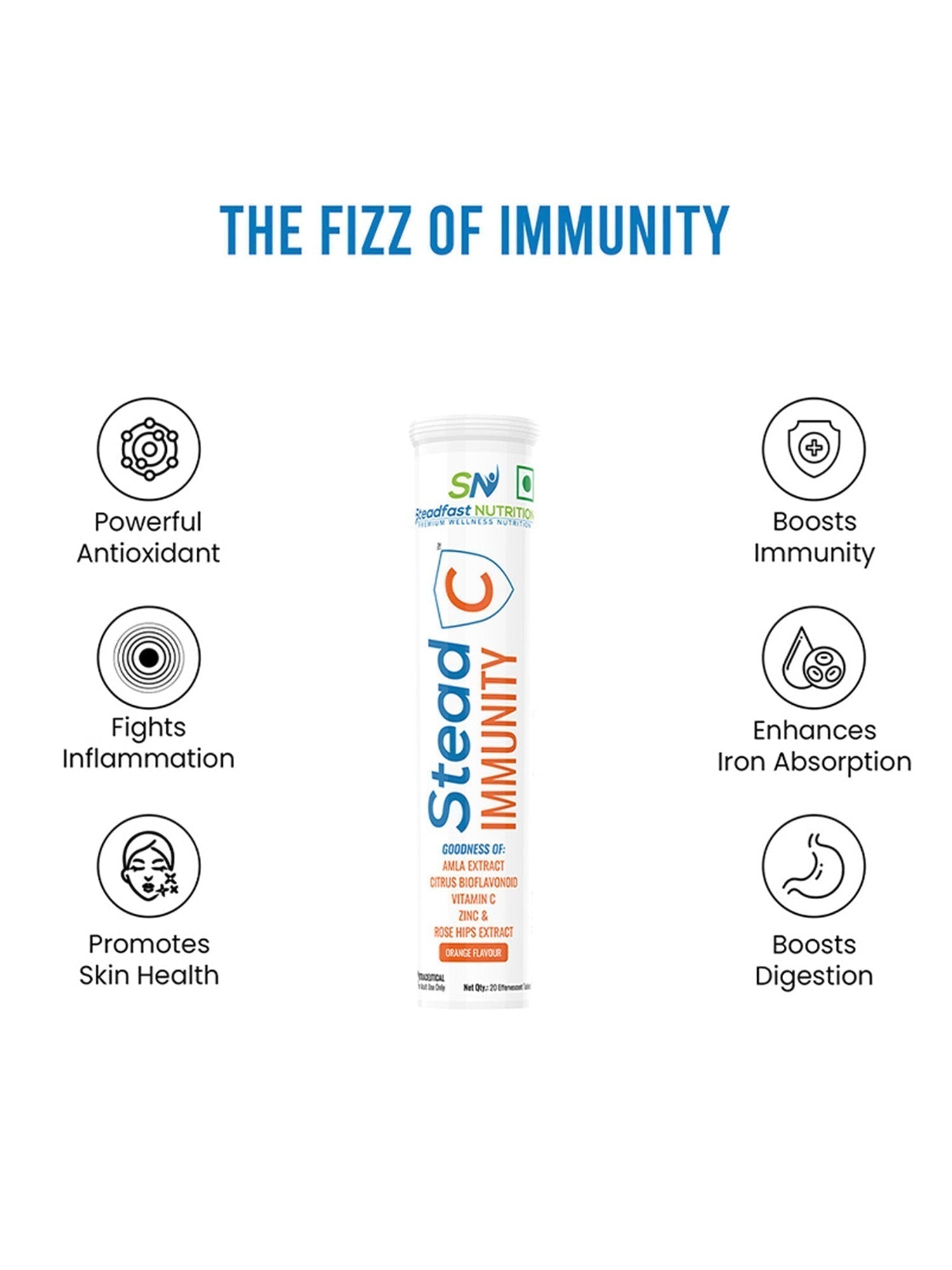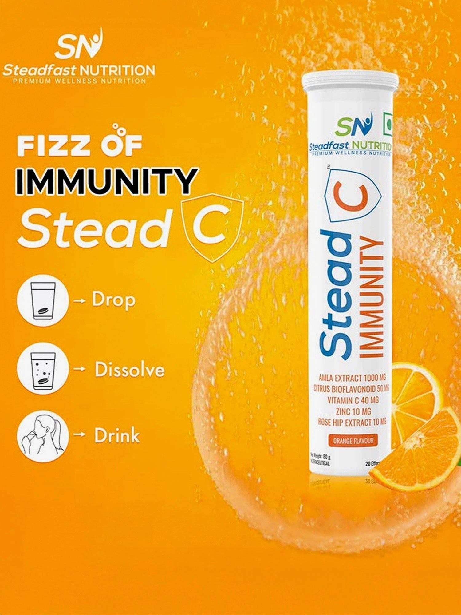 SteadC is a rich source of valuable nutrients, including 1000 mg of Amla Extract, 40 mg of Vitamin C, 50 mg of Citrus Bioflavonoid, 10 mg Rose Hip Extract, and 10 mg of Zinc. These work in tandem to boost the body’s immunity, promote skin health and reduce its risk of developing inflammation, a cause of several chronic diseases. SteadC comes in an effervescent form, hence, is easy to consume and ensures the best possible absorption of these nutrients