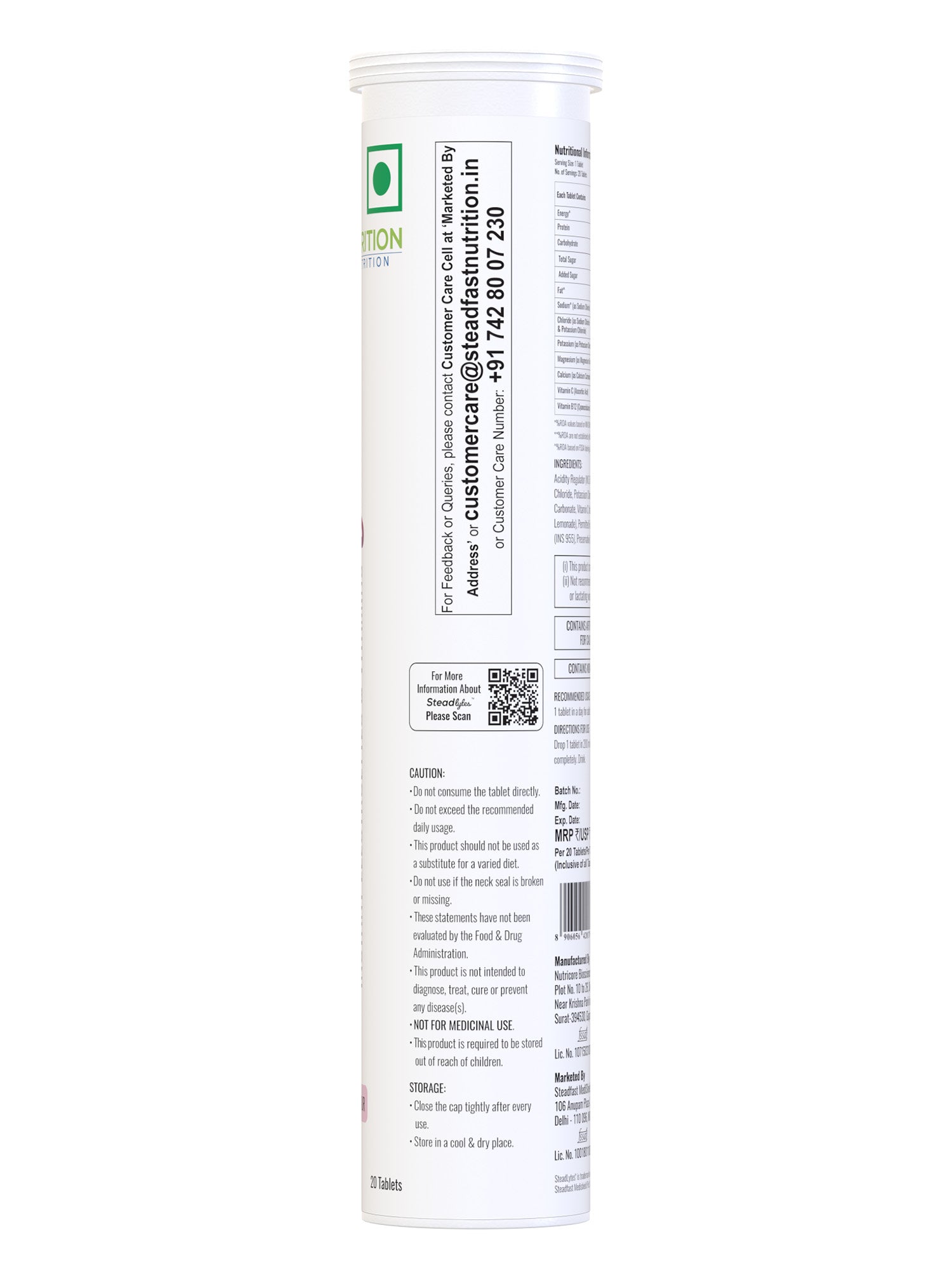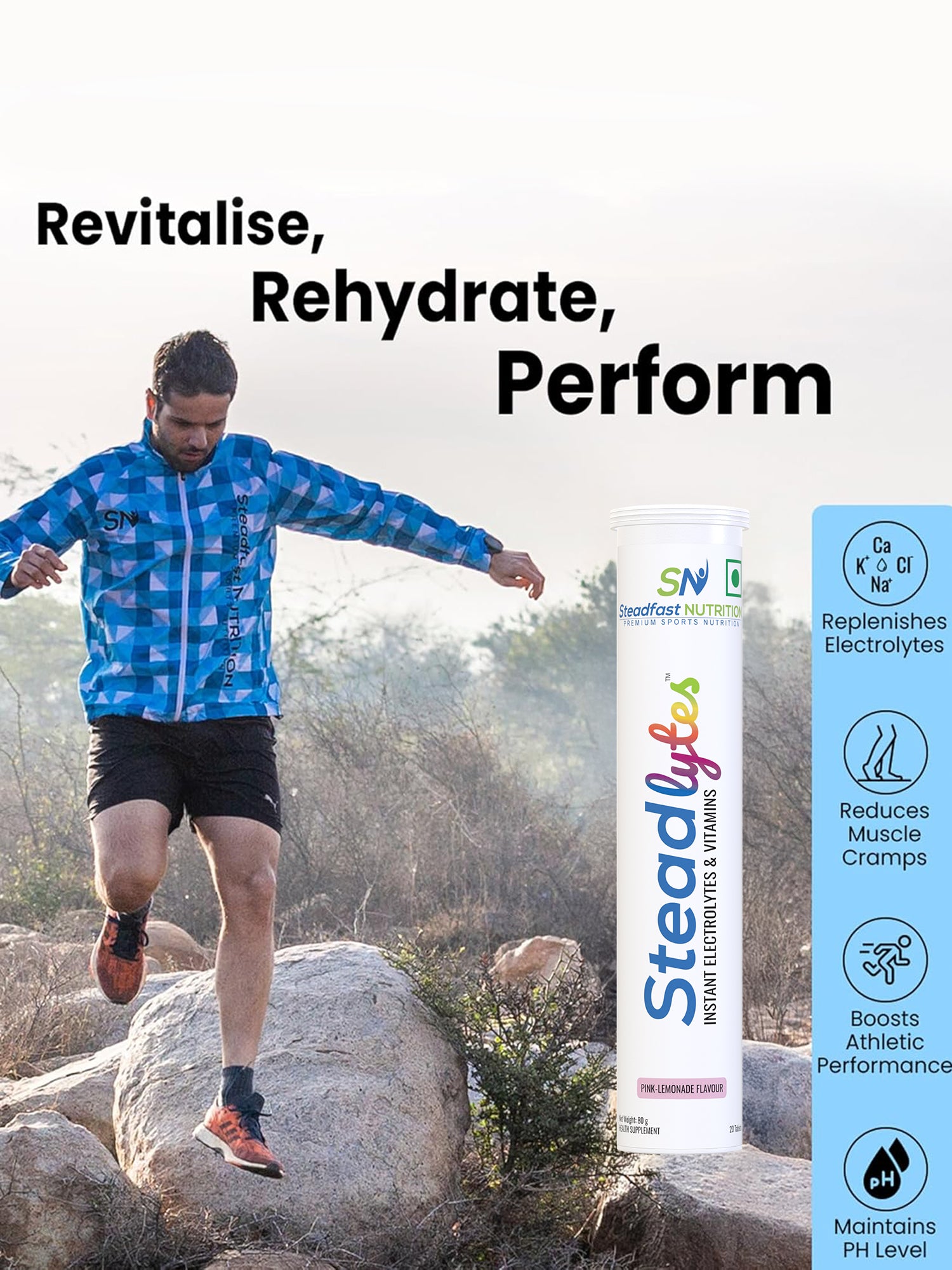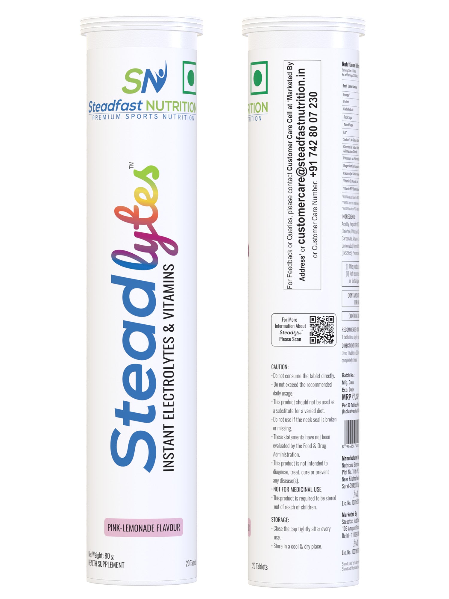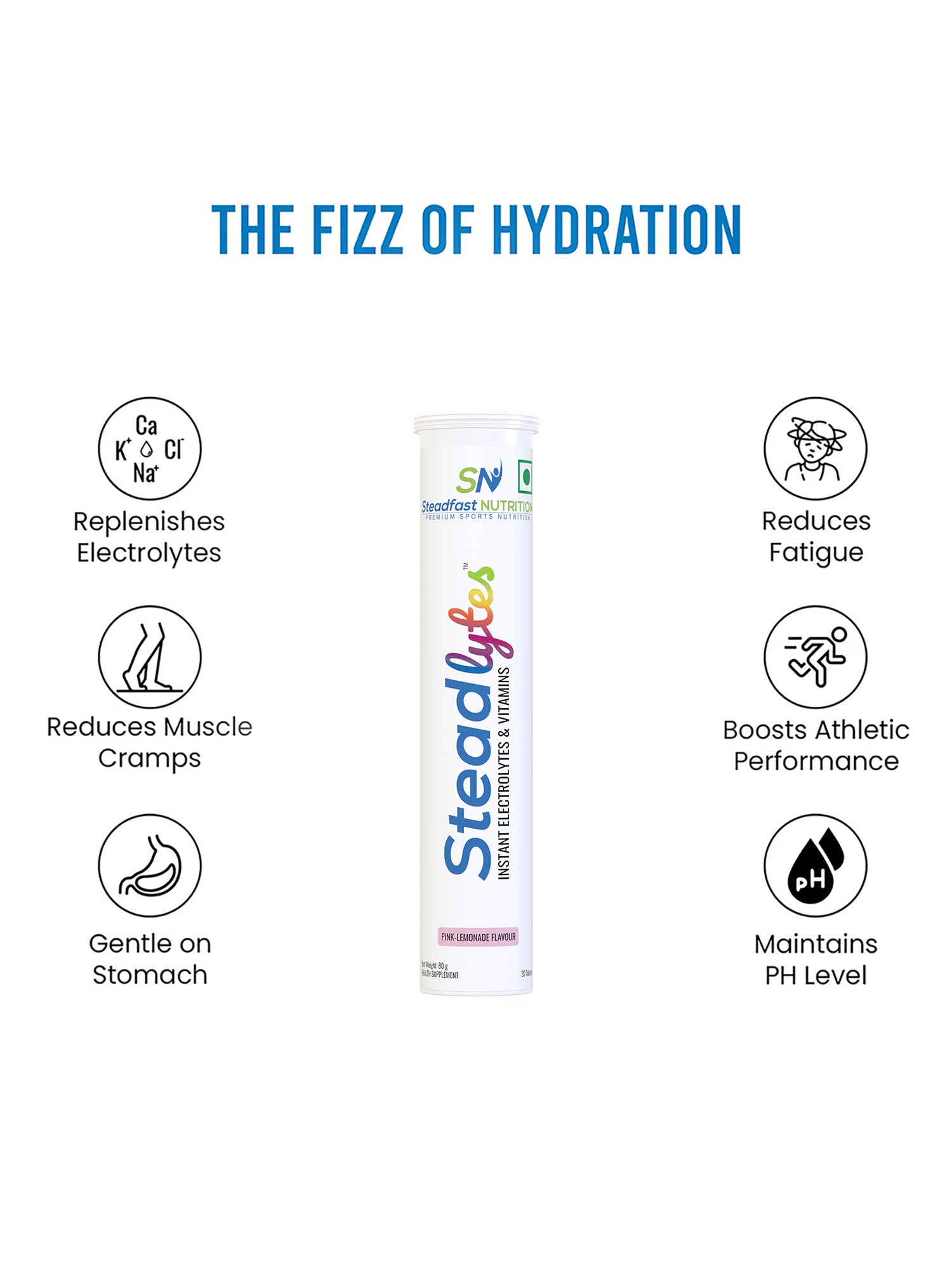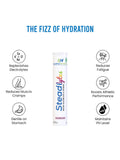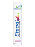 Steadlytes™ is an effervescent supplement that helps replenish lost electrolytes and provides instant hydration. It contains the electrolytes sodium, chloride, potassium, magnesium, and calcium, and Vitamins C and B12, which keep the body hydrated, reduce fatigue and muscle cramps, support bone health, and boost athletic performance. Steadlytes™ comes in an enticing pink-lemonade flavour
