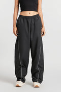 Why You NEED This: The Take A Hike Pants in True Black are part of our Team Spirit Collection and are designed for both style and functionality. Made from a water-resistant, all-weather fabric, these pants feature stylish white piping and zips at the bottom as a cool design element. The pants tighten with a drawstring elastic waistband, offering a comfortable and secure fit, while the signature brand patch adds a sporty vibe, making them perfect for outdoor adventures or casual streetwear.