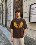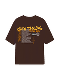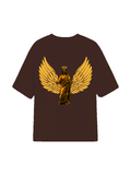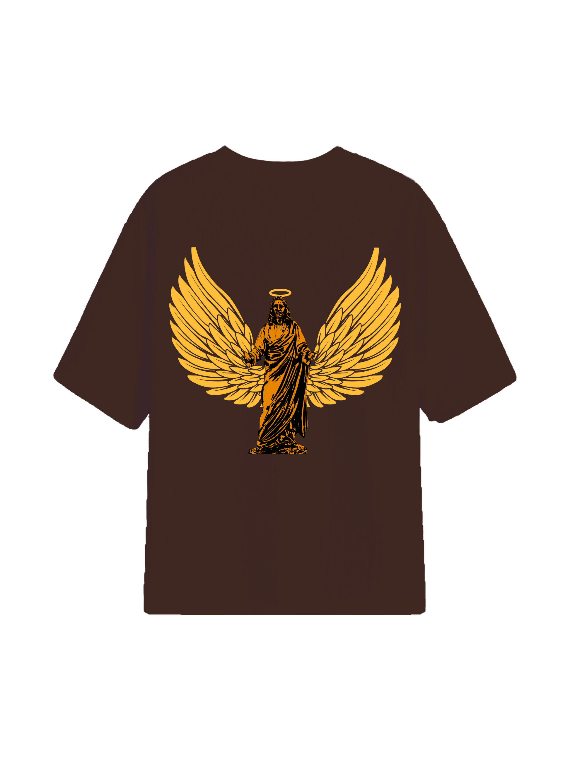 Make a bold statement with this brown oversized T-shirt featuring striking angelic artwork. The back showcases a majestic golden-winged figure with a halo, exuding a celestial yet streetwear-inspired vibe. The front features graffiti-style typography reading "Stop Talking to the God", along with additional text elements that add depth to the design.