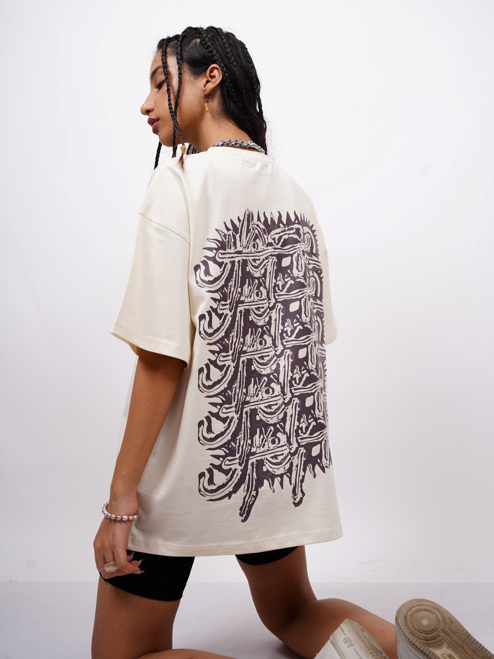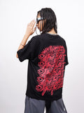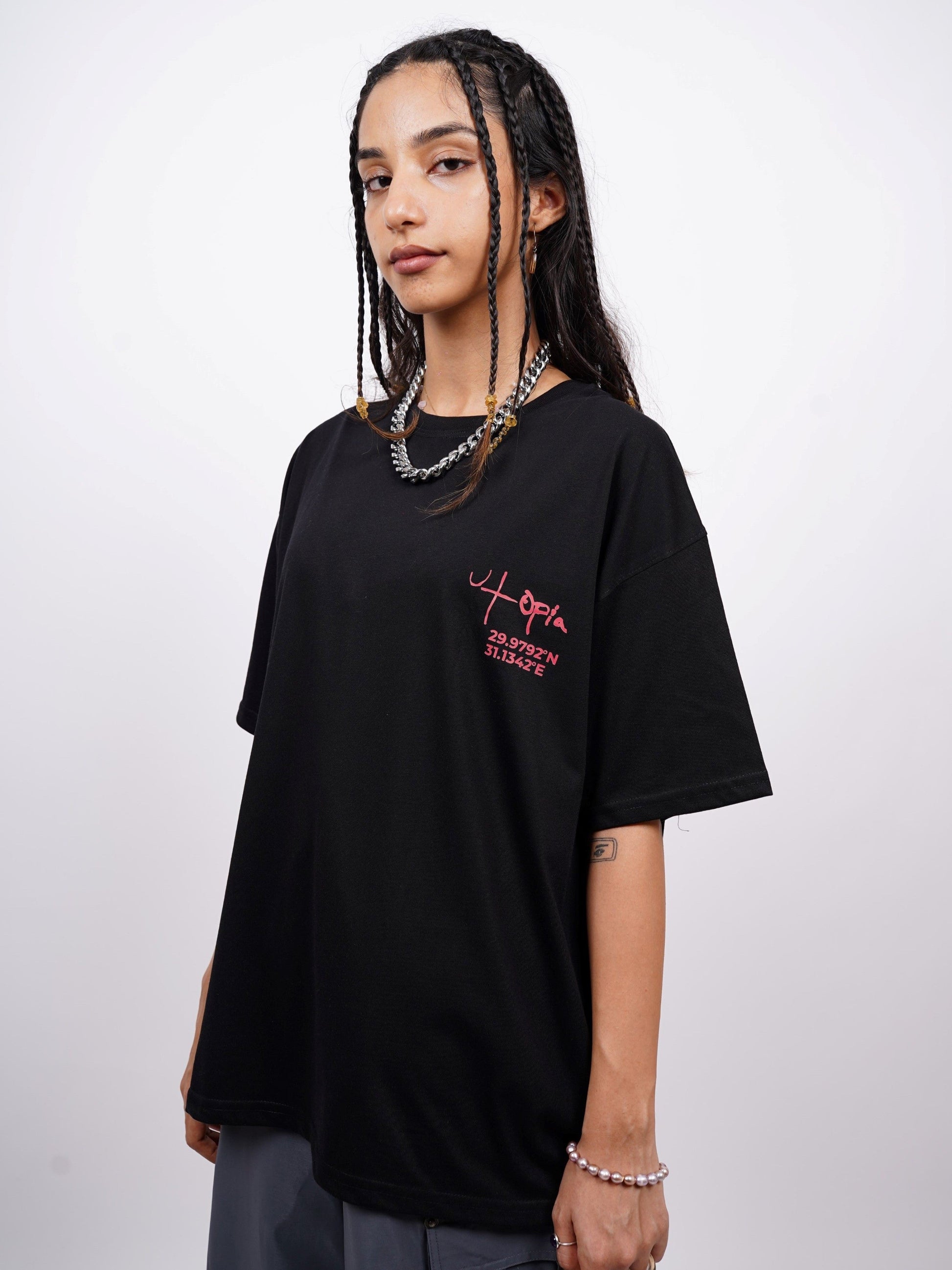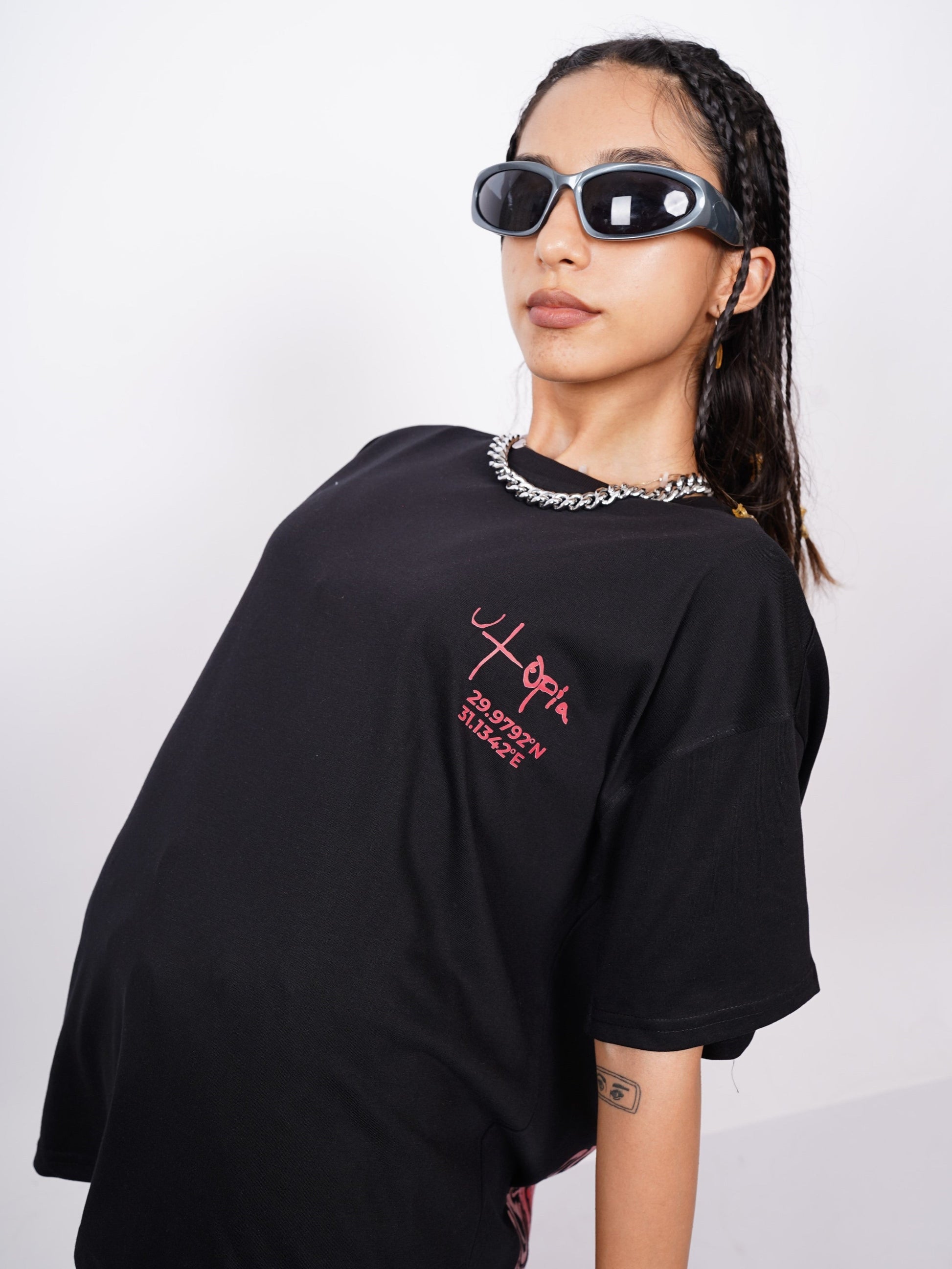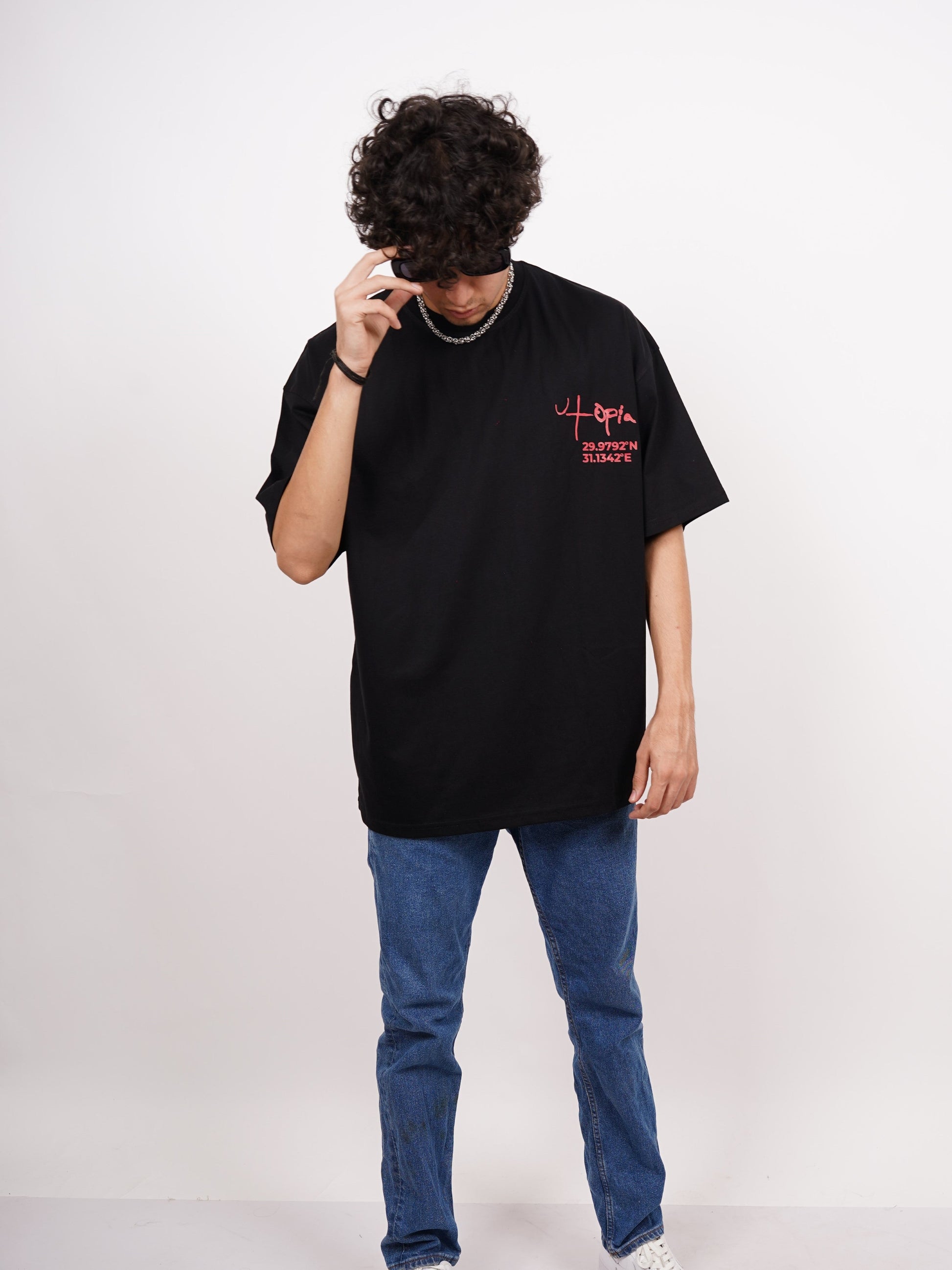 This bold oversized T-shirt is a must-have for street wear lovers, featuring a striking Utopia-themed design. The back showcases a high-contrast black-and-white image of a figure, overlaid with bold red stylized text, creating an urban and futuristic aesthetic.