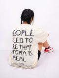 Make a bold statement with the Utopia Oversized Graphic Tee. Featuring an eye-catching back print that spells out "PEOPLE NEED TO SEE THAT UTOPIA IS REAL" using creative human-figure typography, this tee is a perfect blend of fashion and expression.
