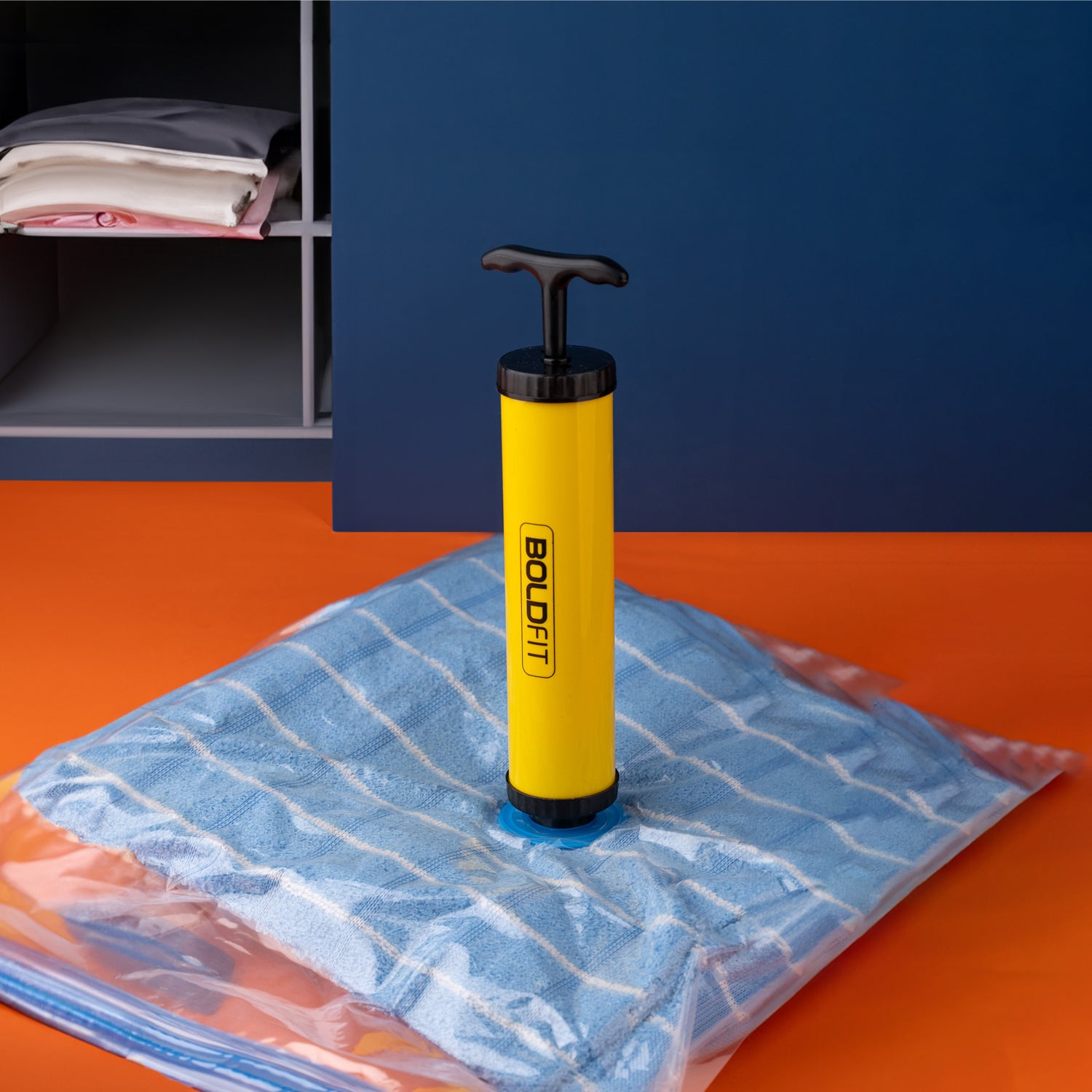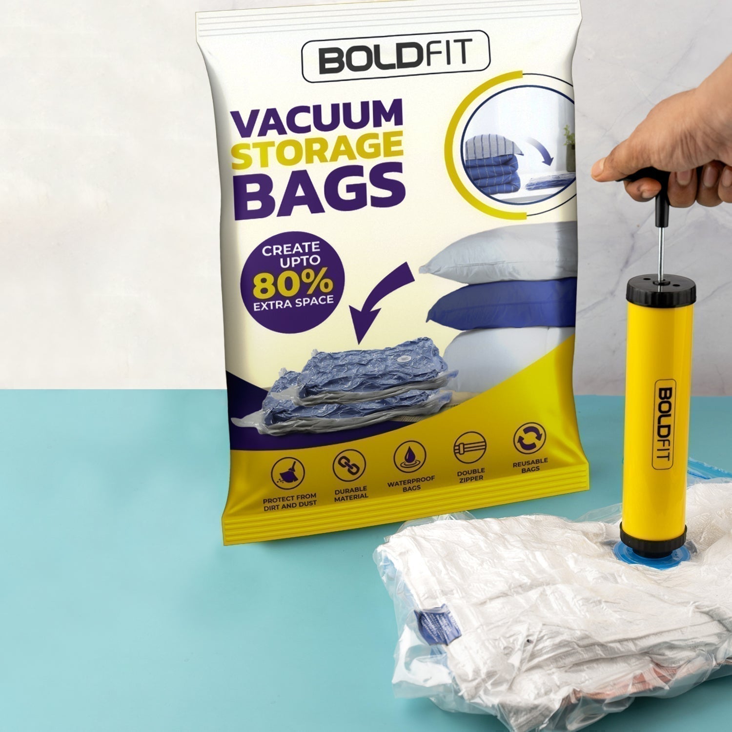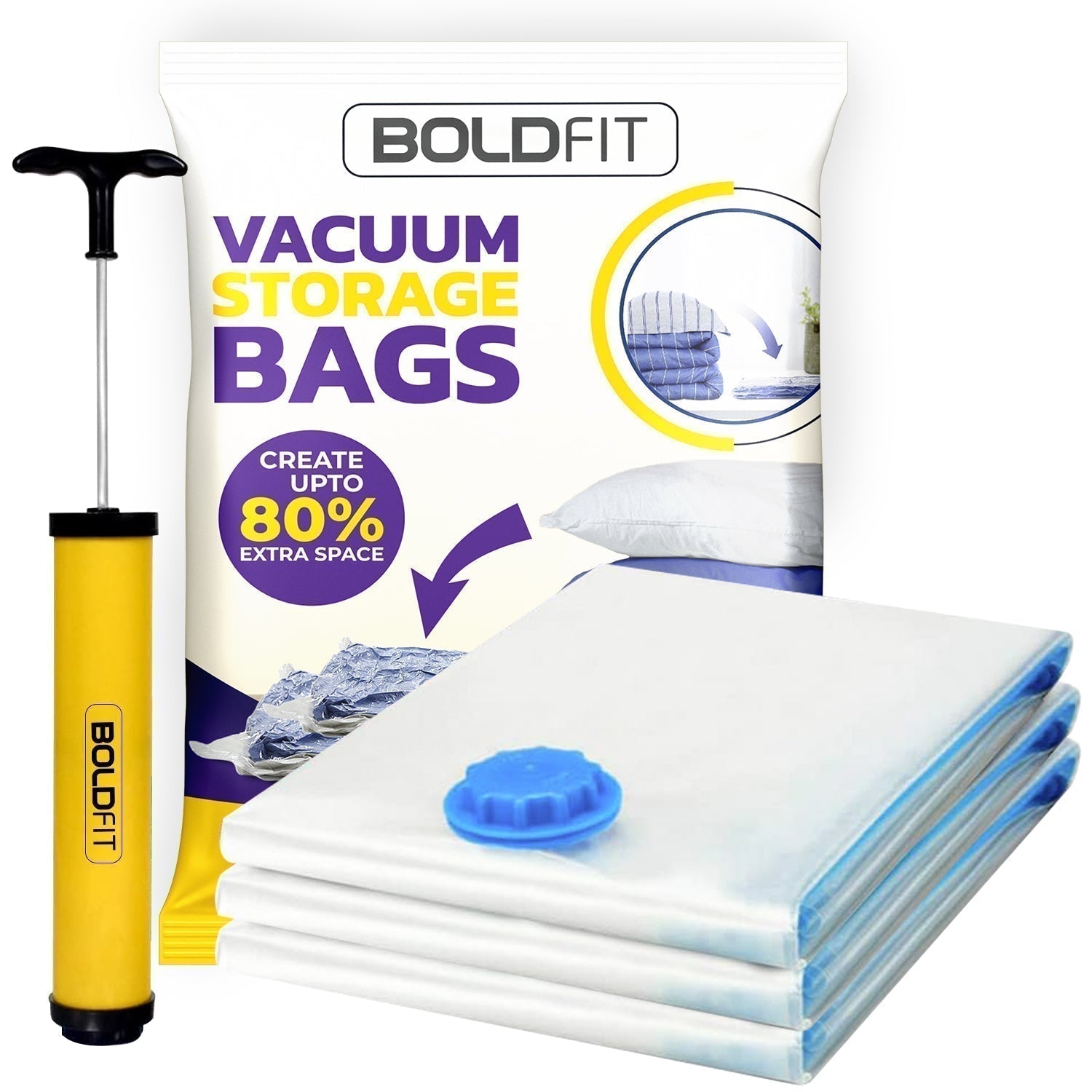 Maximise your storage space with the Boldfit Vacuum Bag with Pump. Designed to securely compress clothes, blankets, and other bulky items, this vacuum bag is your ultimate solution for decluttering your home or packing efficiently for travel. Featuring an easy-to-use hand pump, it ensures a tight seal to keep items protected from dust, moisture, and odors. Durable and reusable, these bags offer a reliable and eco-friendly way to save up to 80% of space while keeping your belongings organized and fresh.