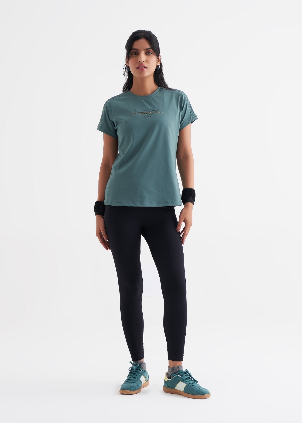 Step into your power with this exceptional training tee. Designed with Side-Front Contour Panels for a flattering fit, it also boasts striking Printed Shoulder Panels featuring a Multi-Colour Graphic. The vibrant Wonder Woman emblem in multi-colour and metallic print adds an iconic touch. With a back reflective logo for safety, this T-shirt is engineered for superior comfort and performance, inspiring your inner hero.