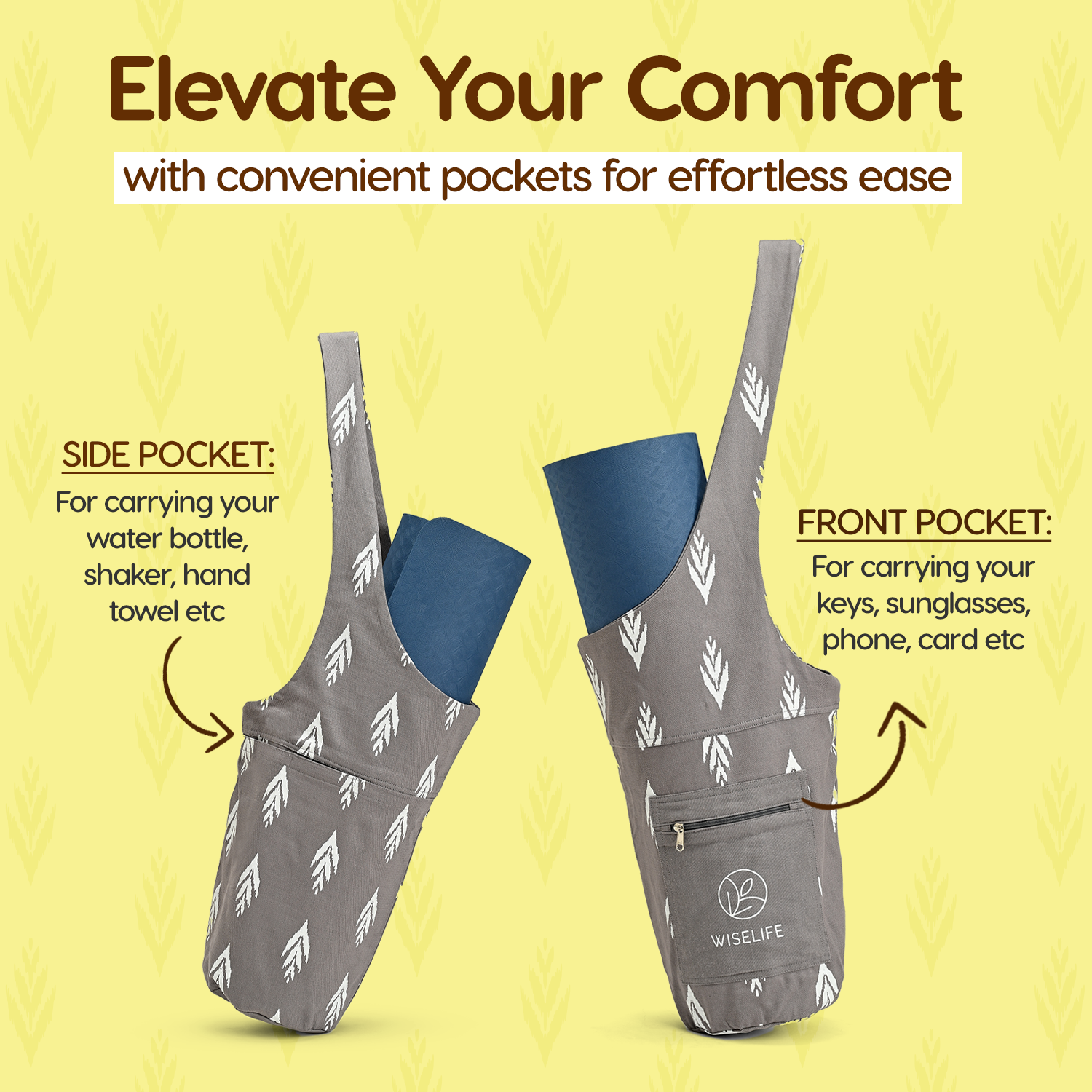 - SPACE FOR MAT & ACCESSORIES: Large Zipper Pocket on the front, Net pocket on the side and Secret zipper pocket on the back is perfect for carrying 1000 ml Sipper / Water Bottle, Hand Towel, Yoga Belt; and is perfect for carrying Keys, Money, Cash, Coins, Cell Phone & Other Essentials.